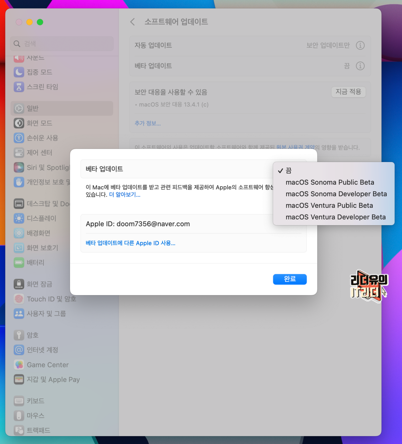 맥OS 소노마 (macOS Sonoma)도 베타 업데이트에서 퍼블릭 베타를 선택해서 업데이트가 가능합니다.