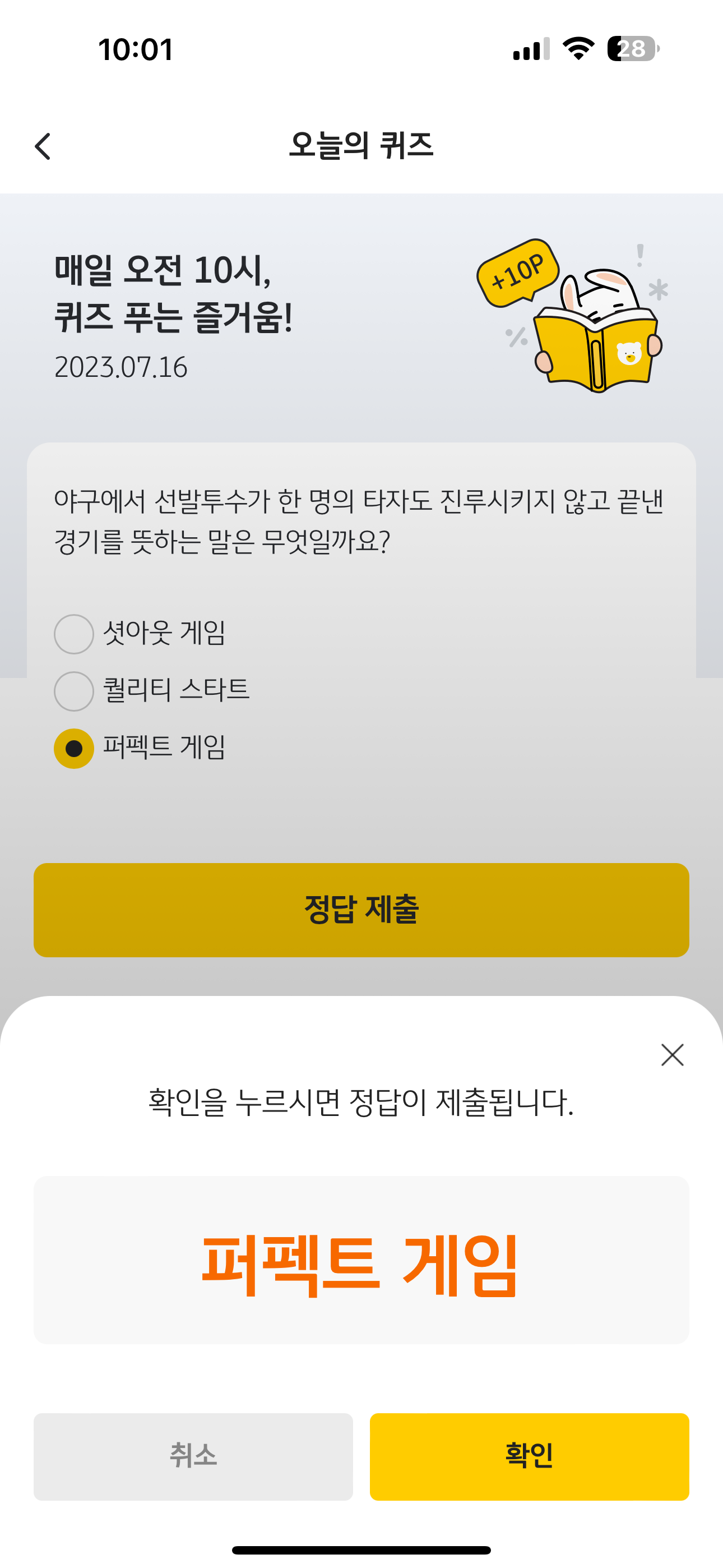KB Pay 오늘의 퀴즈 정답은 퍼펙트 게임 입니다