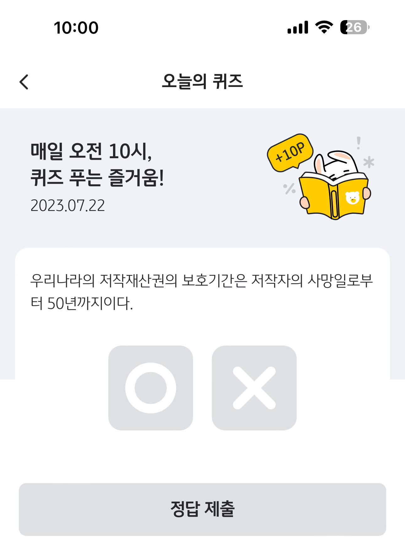 KB Pay 오늘의 퀴즈 7월 22일 정답(우리나라의 저작재산권의 보호기간은 저작자의 사망일로부터 50년까지이다.)