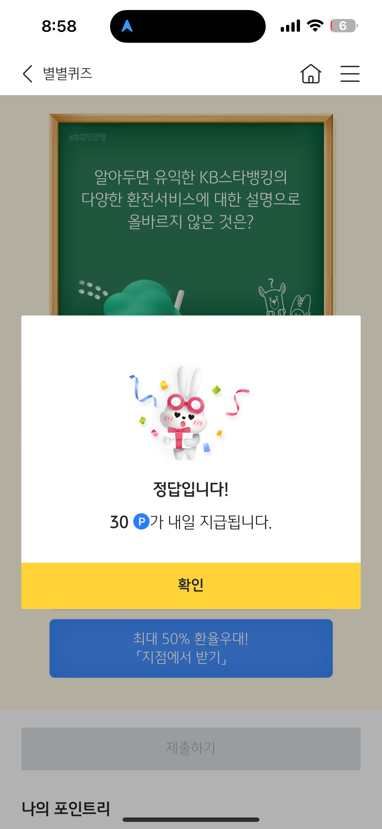 KB스타뱅킹 별별퀴즈 정답은 최대 50% 환율우대! 지점에서 받기 입니다.