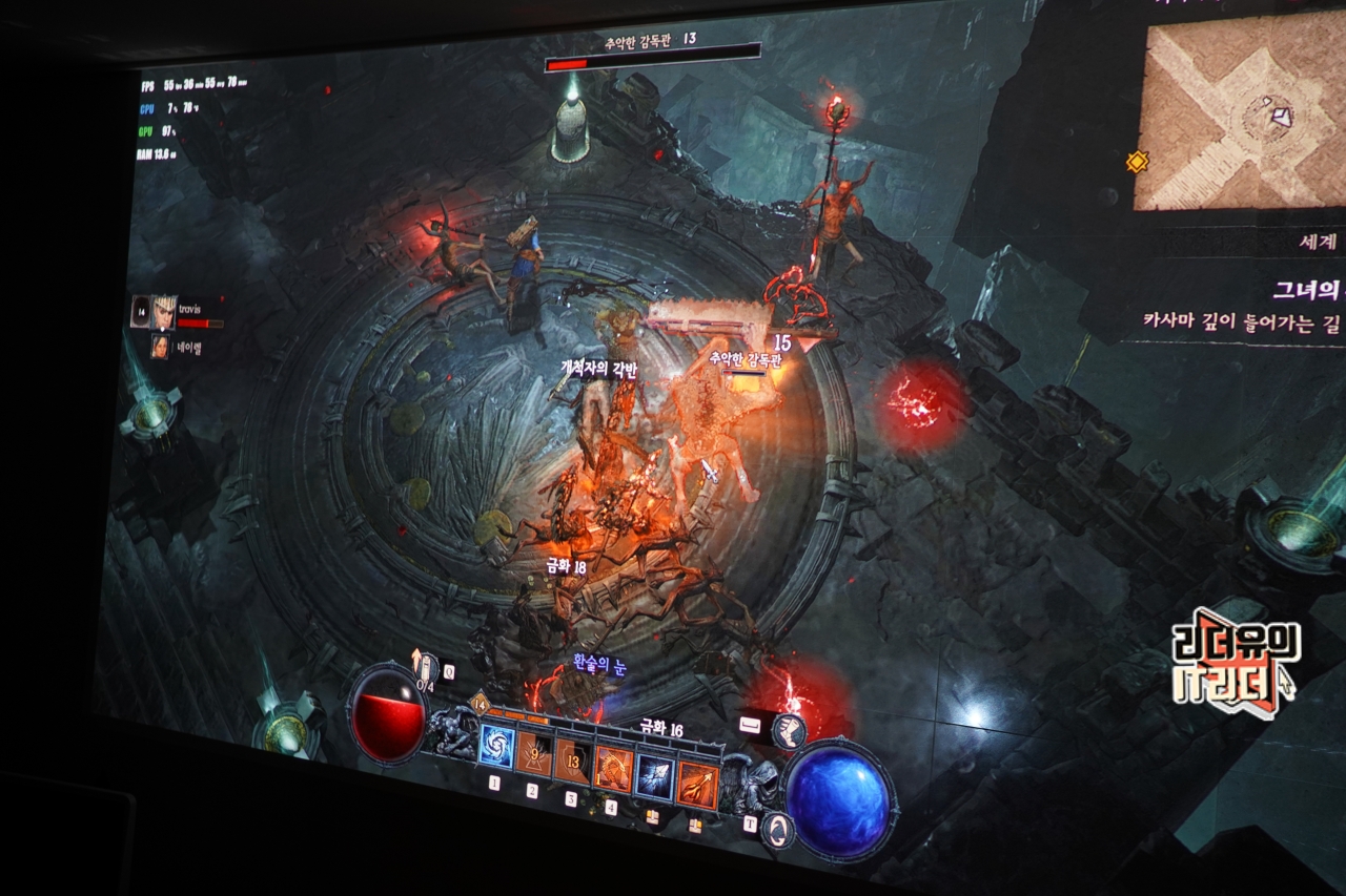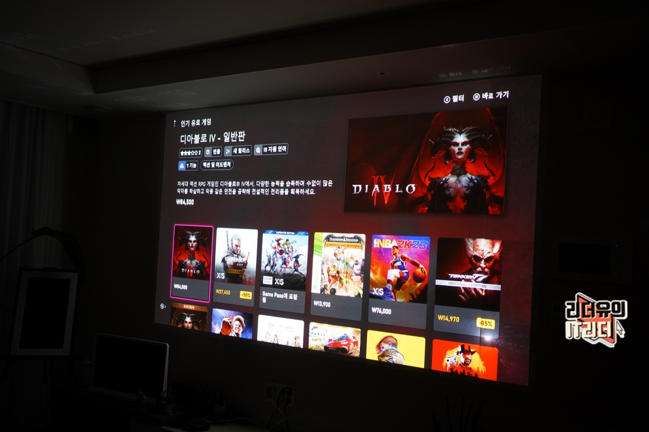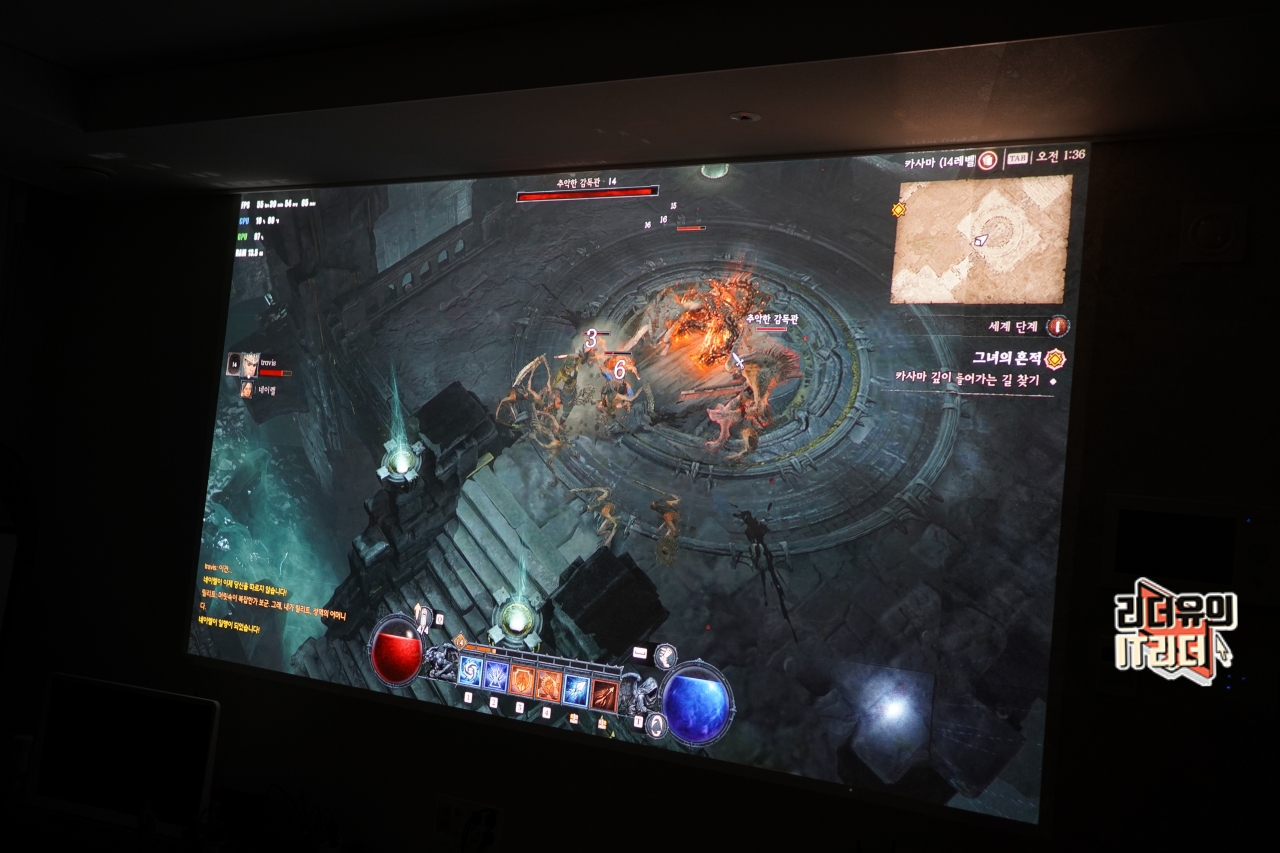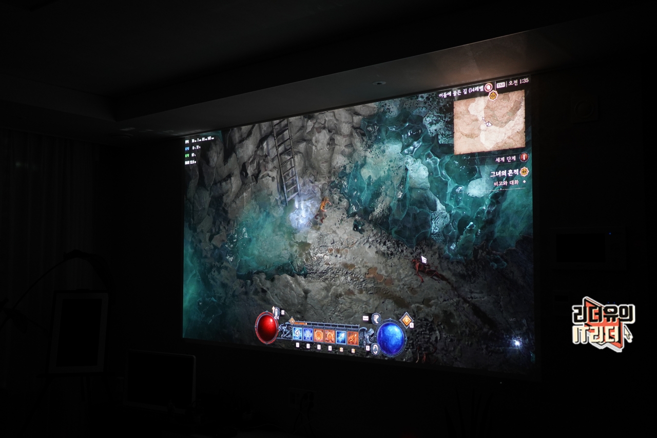 빔프로젝터에서 무엇보다 중요한 것은 화질입니다. 디아블로4 게임을 150인치로 투사해서 보는 모습인데요. 섬세한 4K UHD 해상도로 게임의 디테일을 살려서 보여주고 있고 4K UHD 표준 830만 화소라 제대로된 4K 화질을 구현하고 있습니다.
