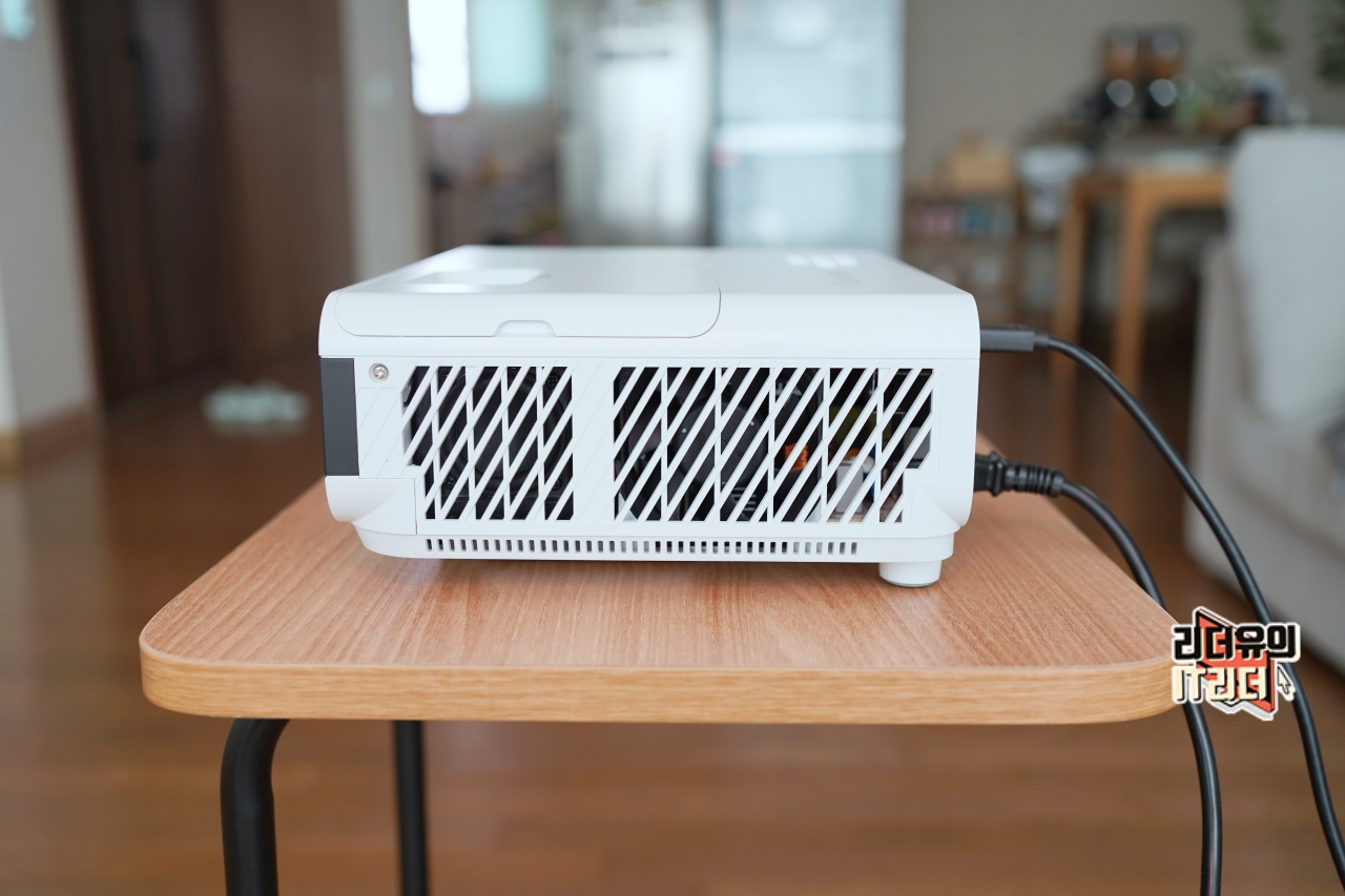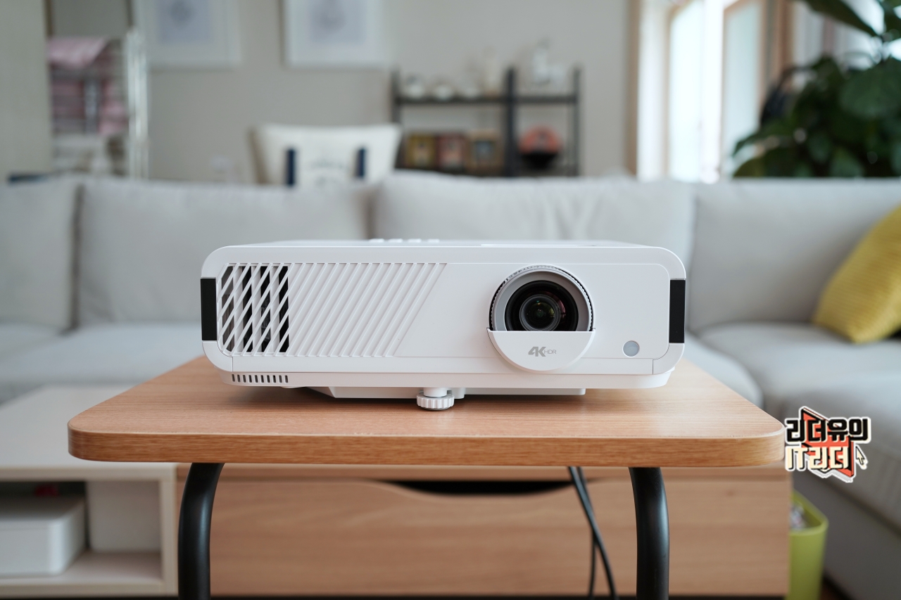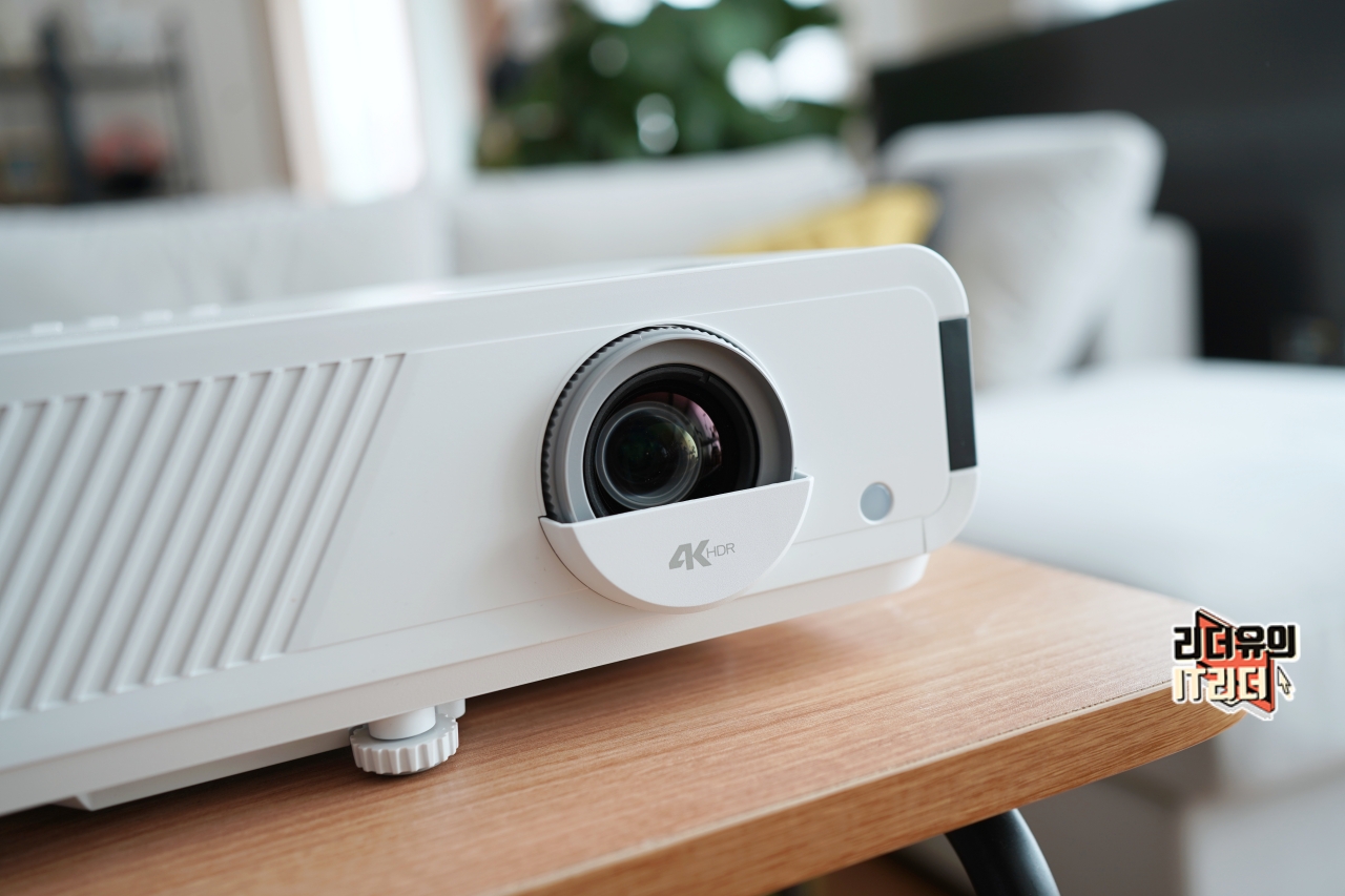 전면에는 4K UHD 해상도 3840 x 2160을 지원하는 대형 렌즈가 있습니다. 4,600안시루멘이라 실내 조명이 들어온 상황에서도 영상을 보기에 전혀 무리가 없습니다. 제가 올린 영상을 보시면 주변 환경에 거의 영향을 받지 않는다는 것을 알 수 있습니다.