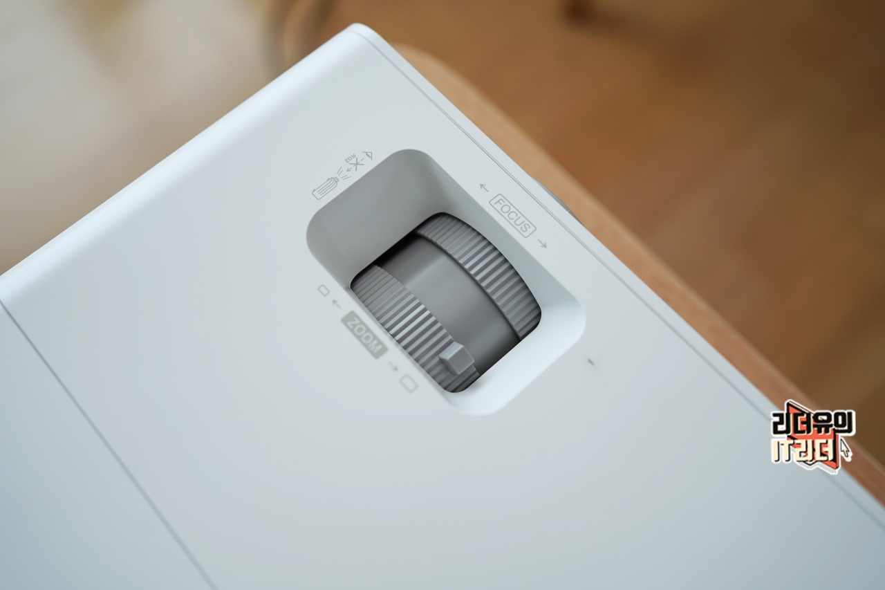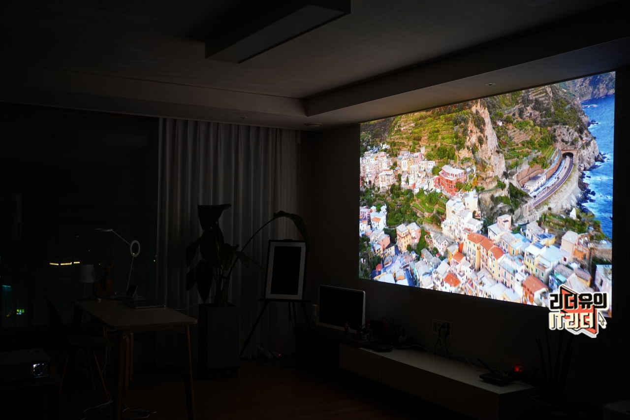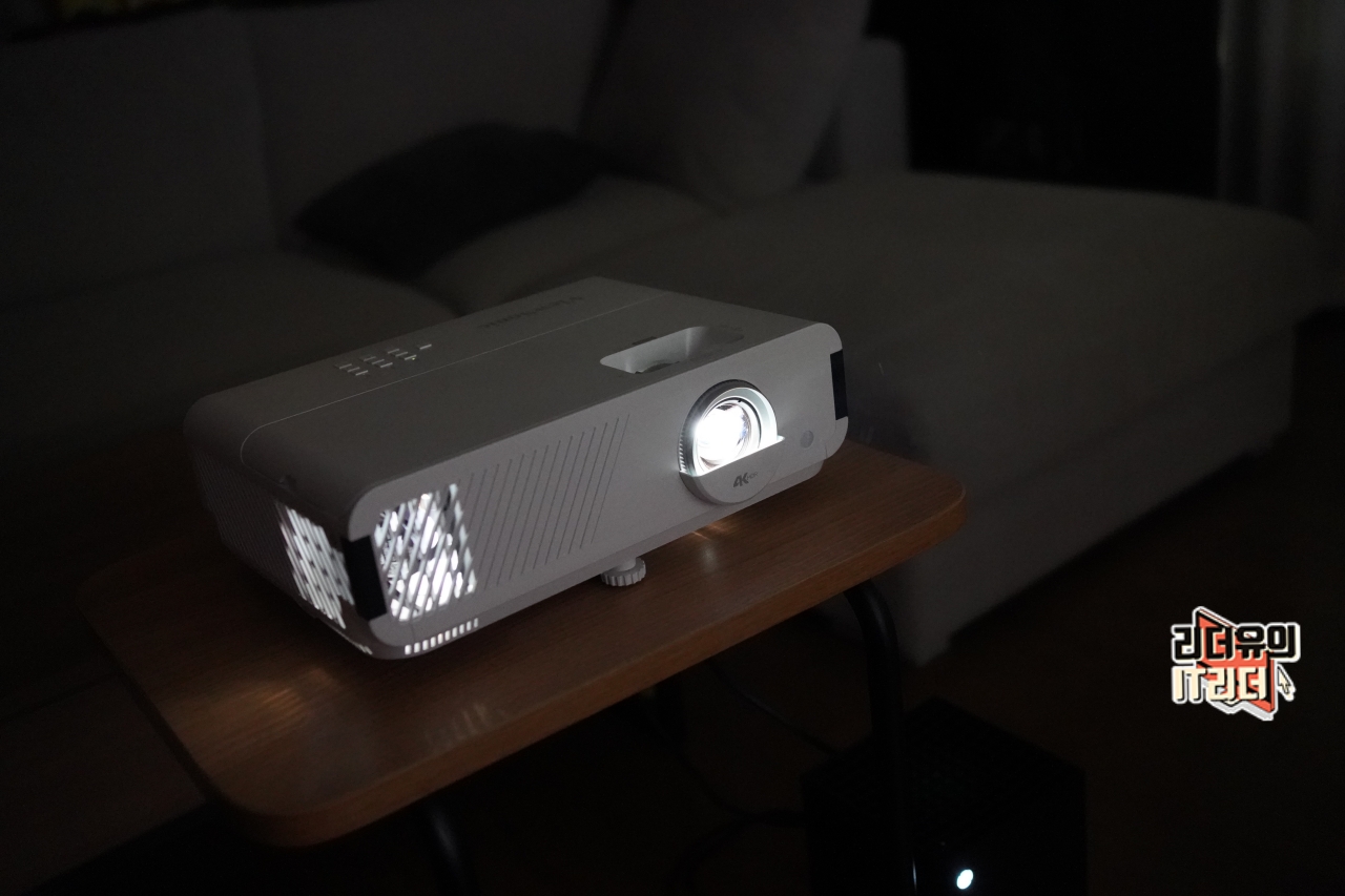 전면에는 4K UHD 해상도 3840 x 2160을 지원하는 대형 렌즈가 있습니다. 4,600안시루멘이라 실내 조명이 들어온 상황에서도 영상을 보기에 전혀 무리가 없습니다. 제가 올린 영상을 보시면 주변 환경에 거의 영향을 받지 않는다는 것을 알 수 있습니다.