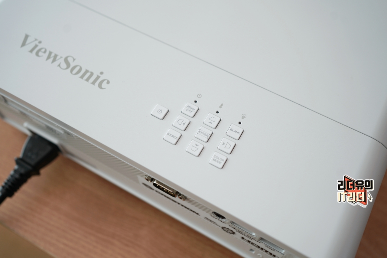윗면에는 리모컨 없이도 다이렉트 컨트롤이 가능한 물리적 기능 버튼들이 배치되어 있습니다. 전원, 메뉴, 키스톤 보정, 소스, 컬러 모드 등 자주 쓰일 수 있는 기능들을 제공해 리모컨 없을때 빠르게 컨트롤이 가능합니다.