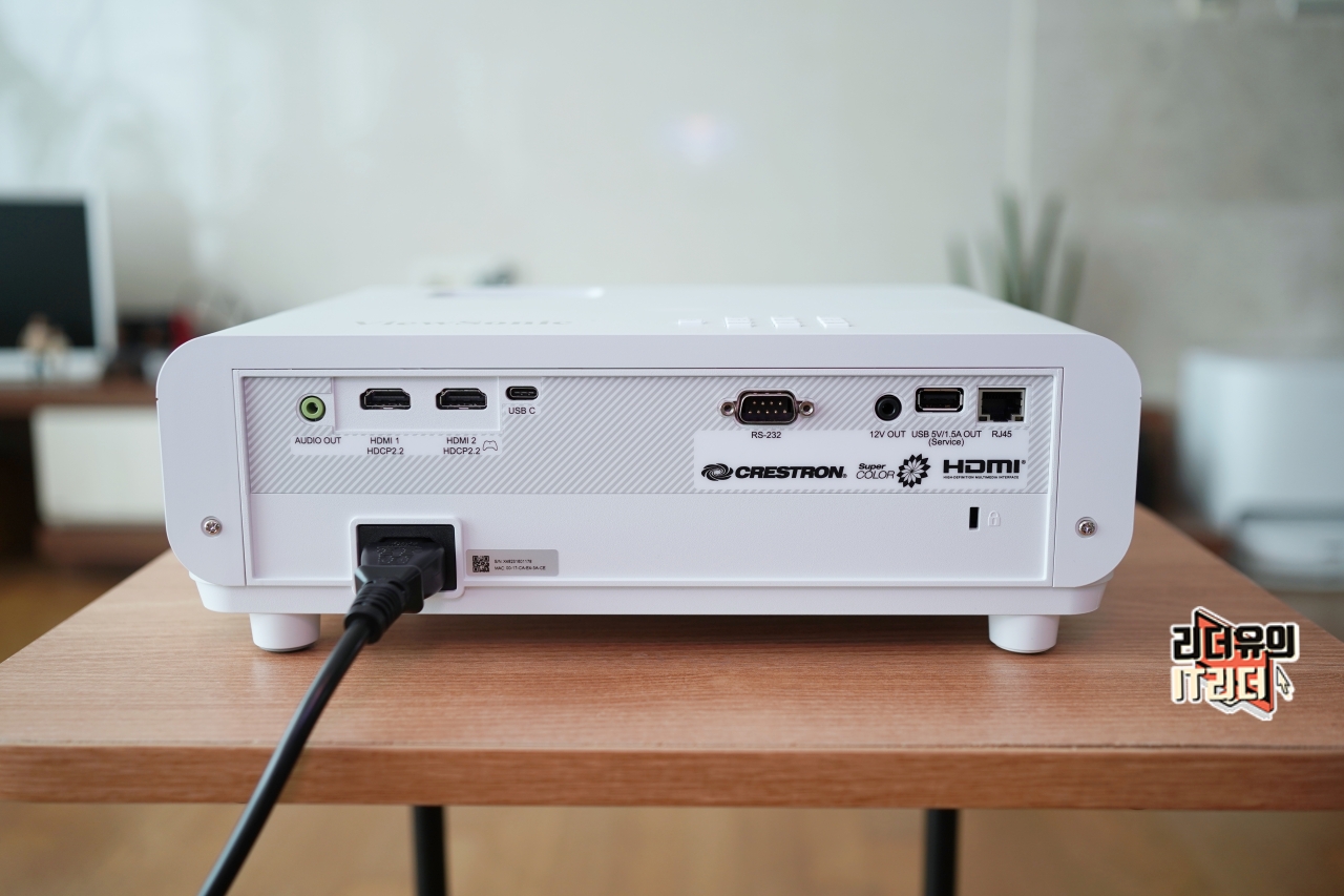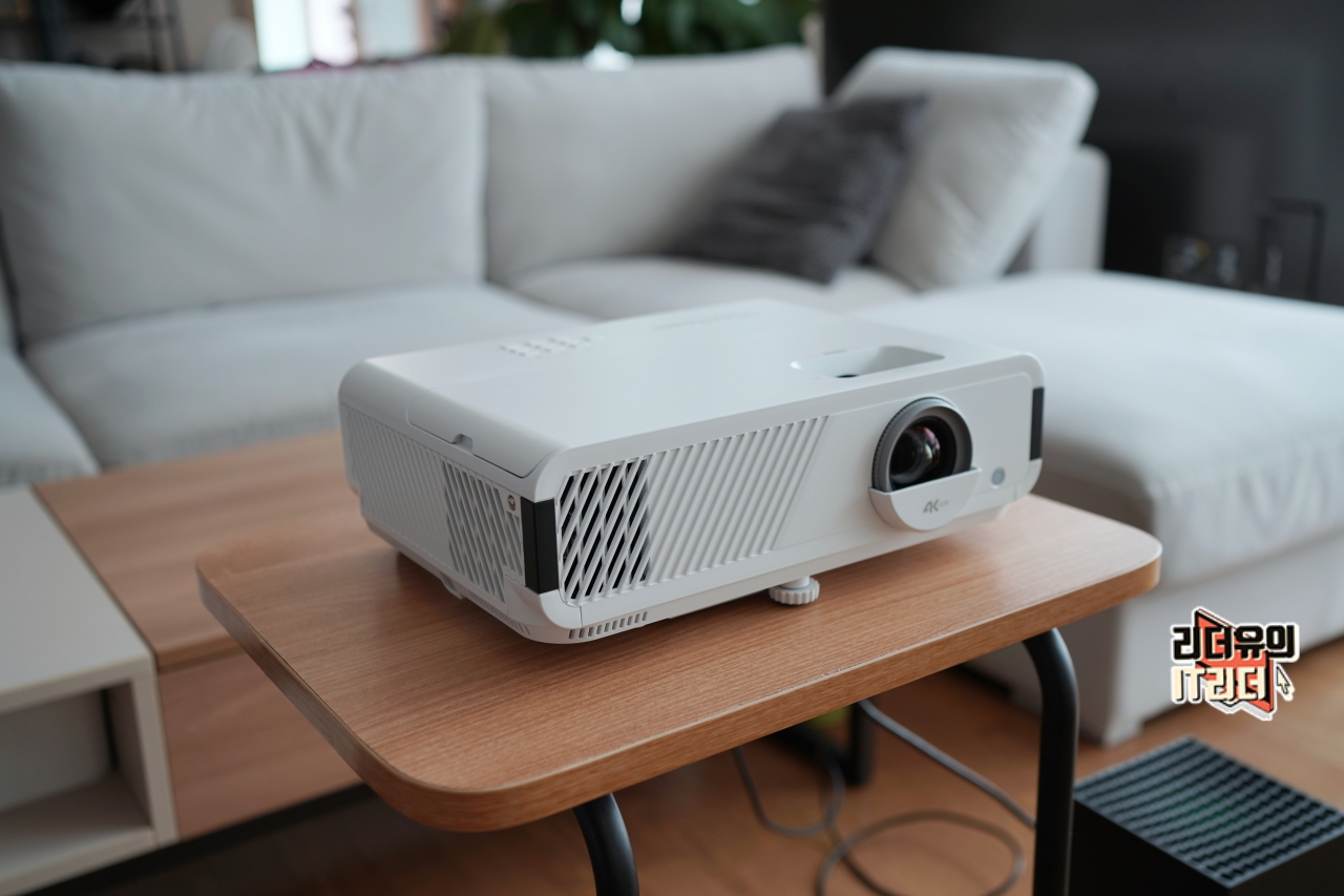 전면에는 4K UHD 해상도 3840 x 2160을 지원하는 대형 렌즈가 있습니다. 4,600안시루멘이라 실내 조명이 들어온 상황에서도 영상을 보기에 전혀 무리가 없습니다. 제가 올린 영상을 보시면 주변 환경에 거의 영향을 받지 않는다는 것을 알 수 있습니다.