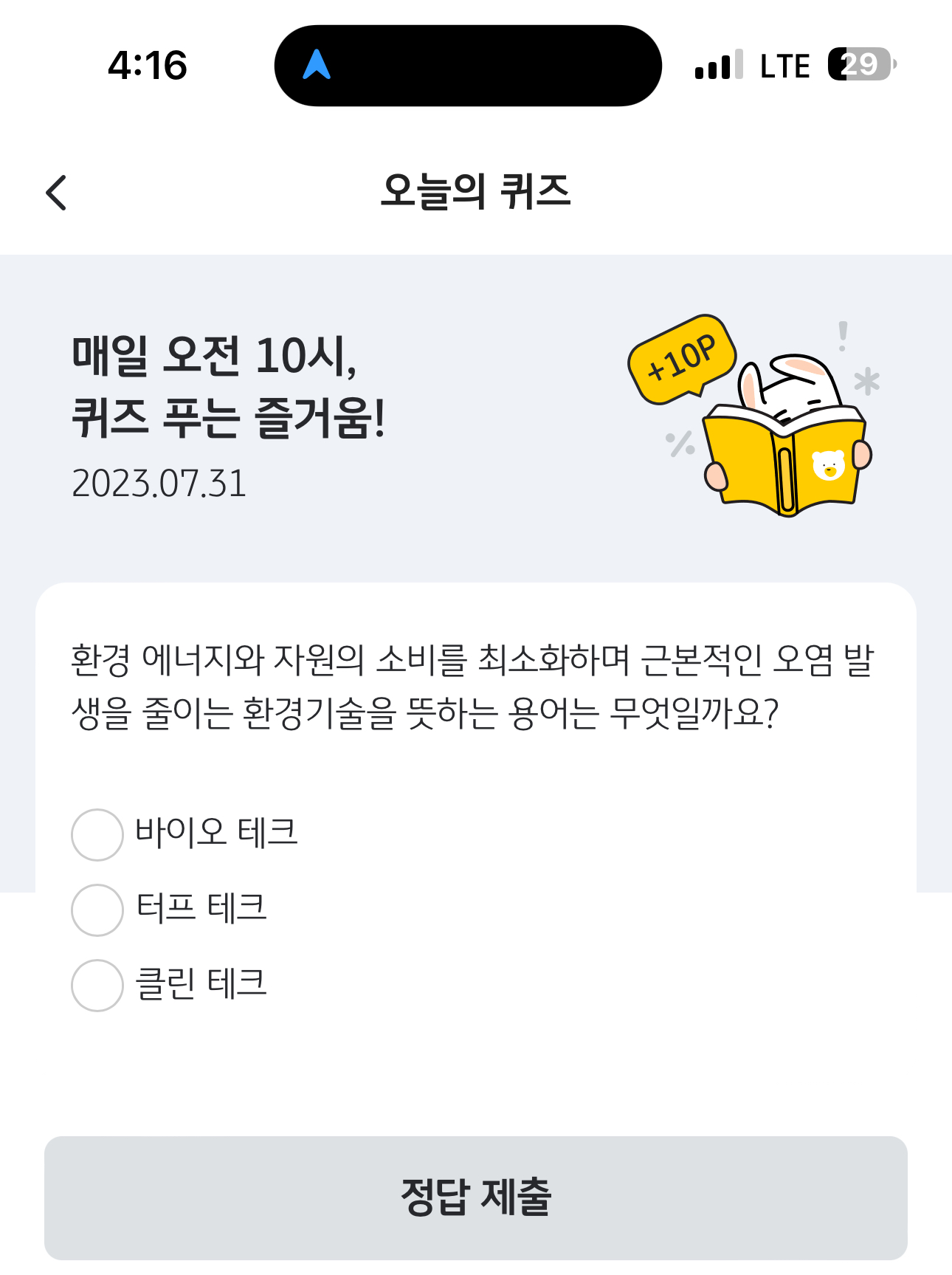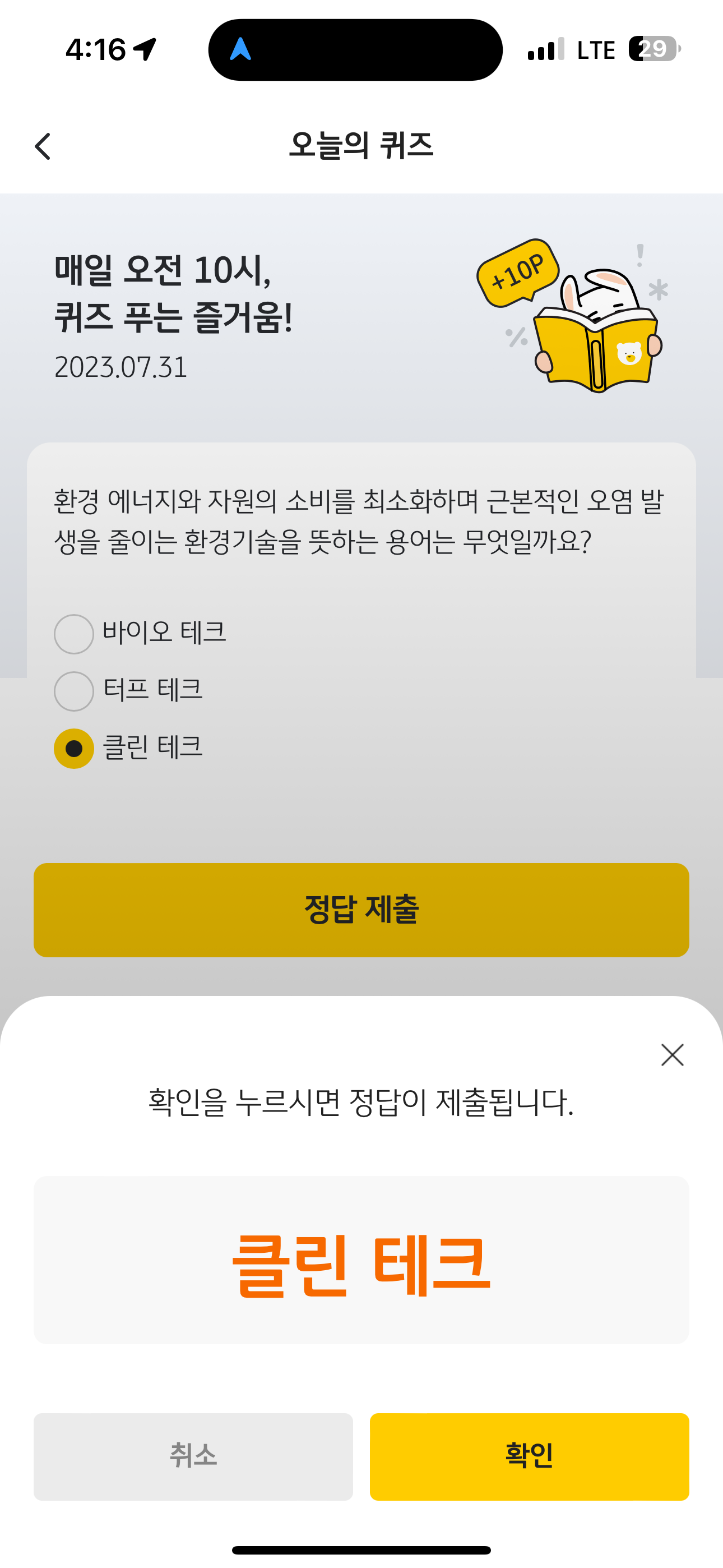 KB pay 오늘의 퀴즈 정답은 클린 테크 입니다