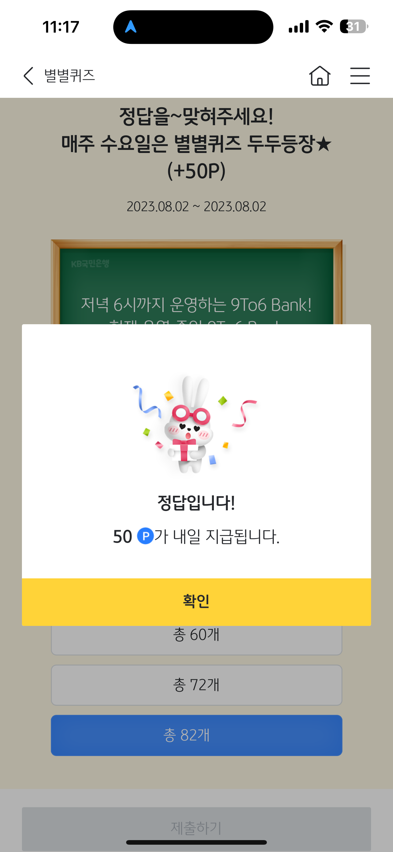 KB스타뱅킹 별별퀴즈 정답은 총 82개 입니다.