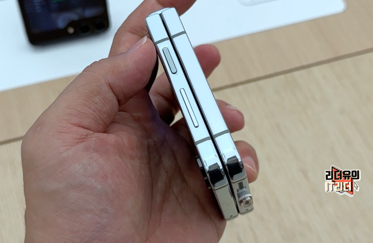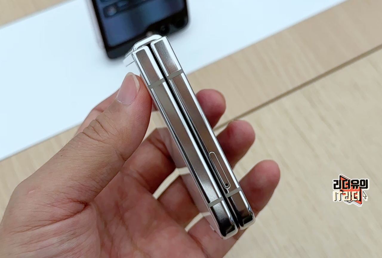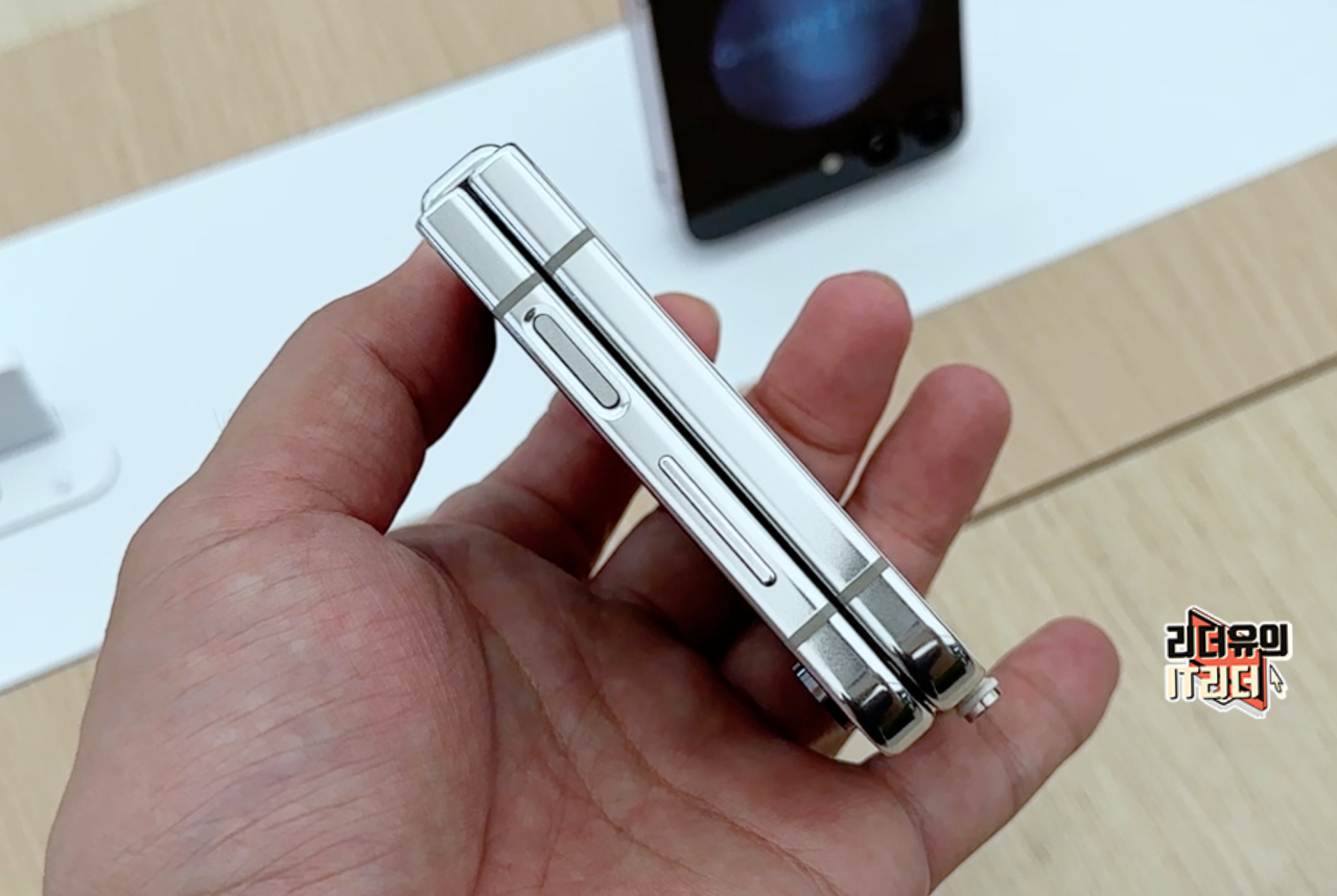 갤럭시Z 플립5 크림 펼쳤을때 옆면 모습입니다. 크롬 테두리 라인으로 산뜻한 디자인을 느낄 수 있고 슬림한 디자인이 좋습니다.