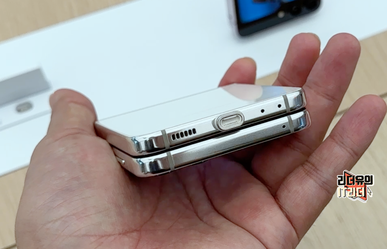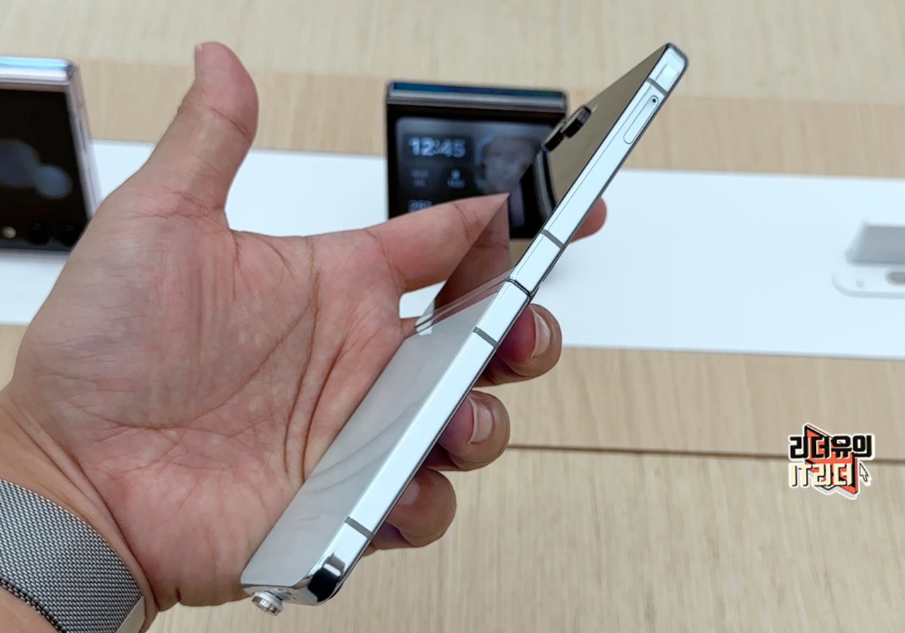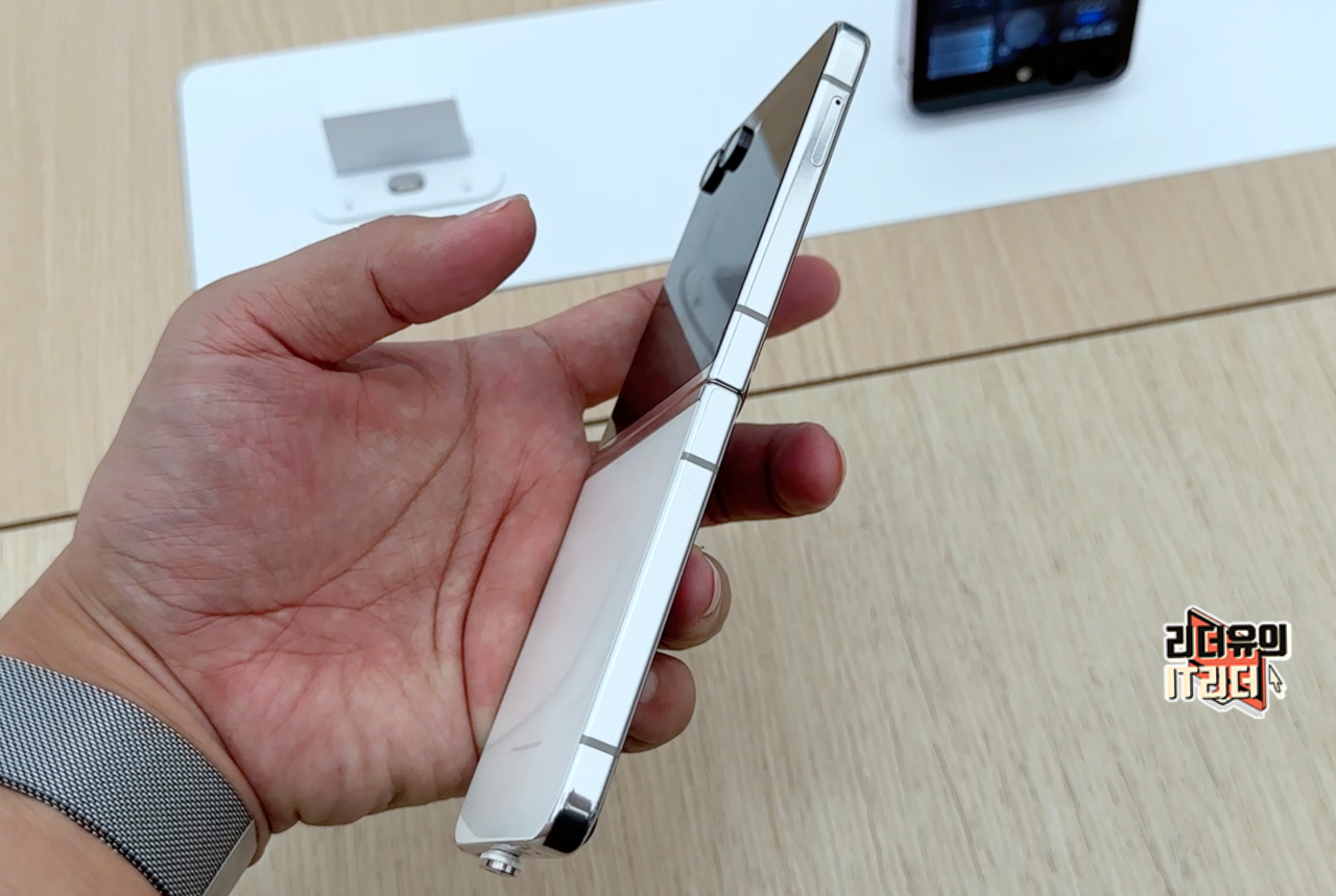 갤럭시Z 플립5 크림 펼쳤을때 옆면 모습입니다. 크롬 테두리 라인으로 산뜻한 디자인을 느낄 수 있고 슬림한 디자인이 좋습니다.