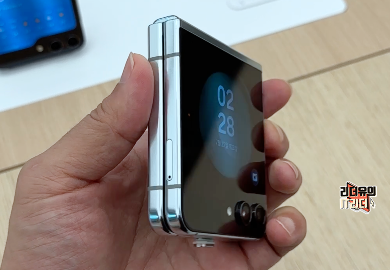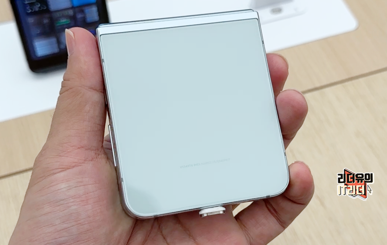 이번에 새롭게 추가된 갤럭시Z 플립5 민트 색상입니다. 전면에서 봤을때 힌지 영역에 민트 테두리 프레임 색상을 볼 수 있습니다.