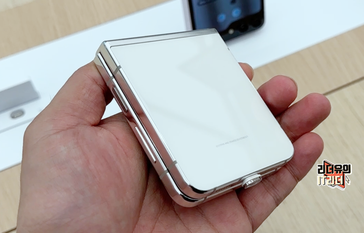 갤럭시Z 플립5 크림 후면은 약간은 베이지톤이 가미된 색상으로 얼핏 보면 화이트 색상 같아 보이기도 합니다. 글라스 처리된 반짝 거리는 디자인으로 화사한 디자인 매력이 좋습니다.