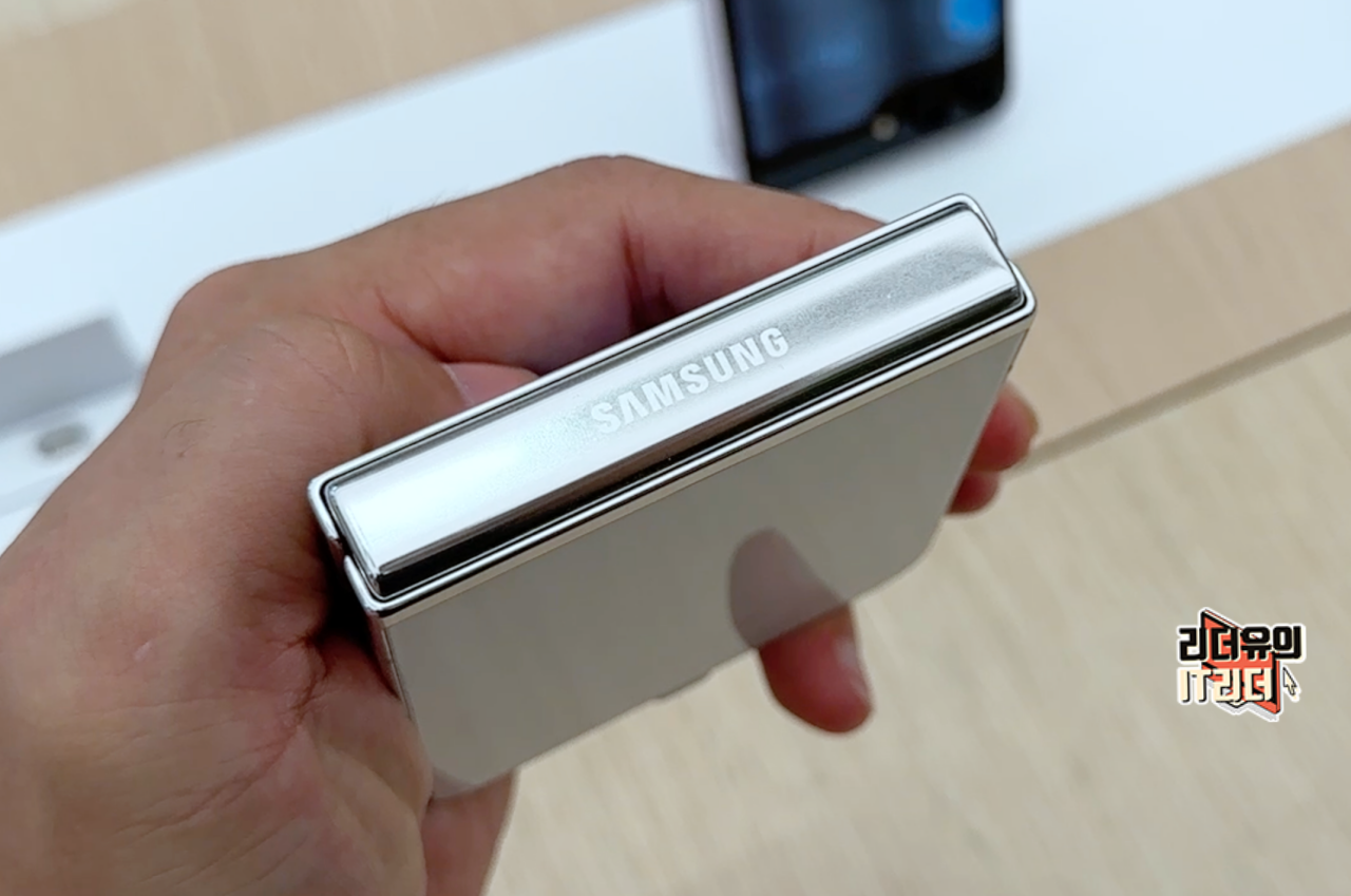 삼성 갤럭시Z 플립5 크림 색상 입니다. 테두리 프레임을 보면 크롬 라인이 들어가 포인트되는 디자인을 볼 수 있습니다.