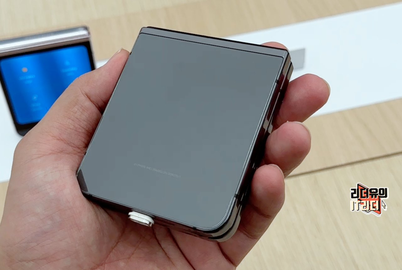 갤럭시Z 플립5 그라파이트 펼쳤을때 후면 모습입니다. 블랙 계열의 색상이라 위아래가 통일된 색상의 매력을 보여주고 있습니다. 물론 위에는 완전 검정이고 아래는 그라파이트 색상이라 투톤의 디자인 포인트를 느낄 수 있습니다.