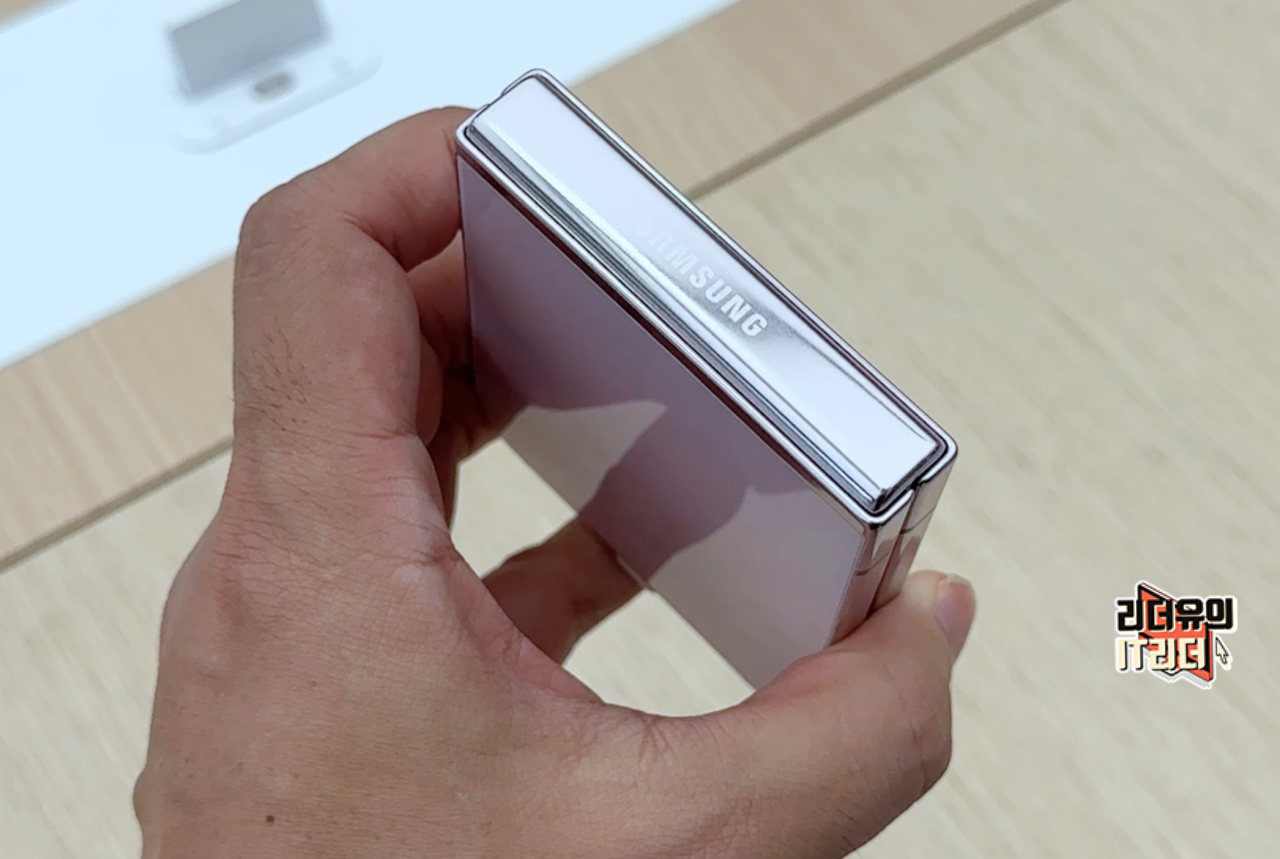 갤럭시Z 플립5 라벤더 색상 테두리, 힌지 영역도 라벤더 색상이 적용된 크롬으로 되어 있습니다.