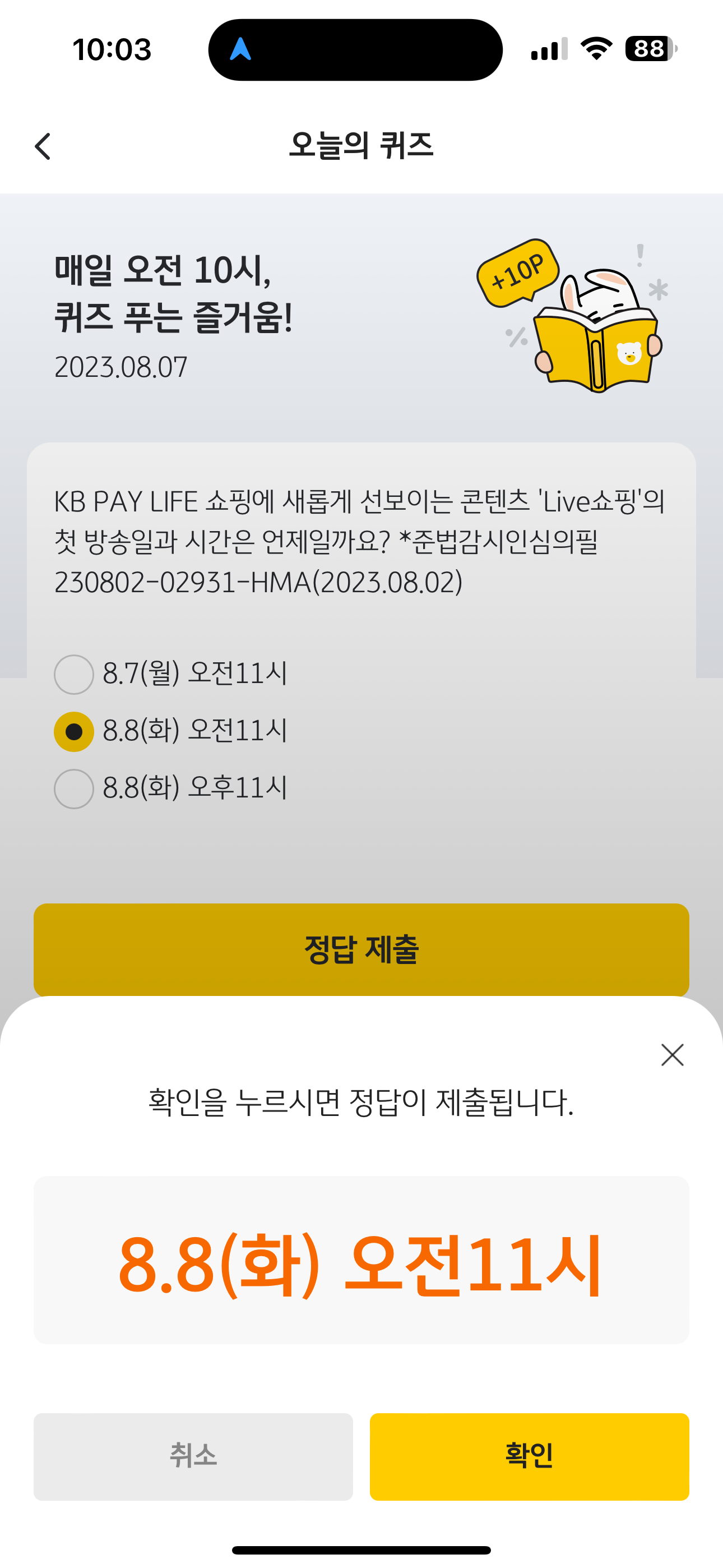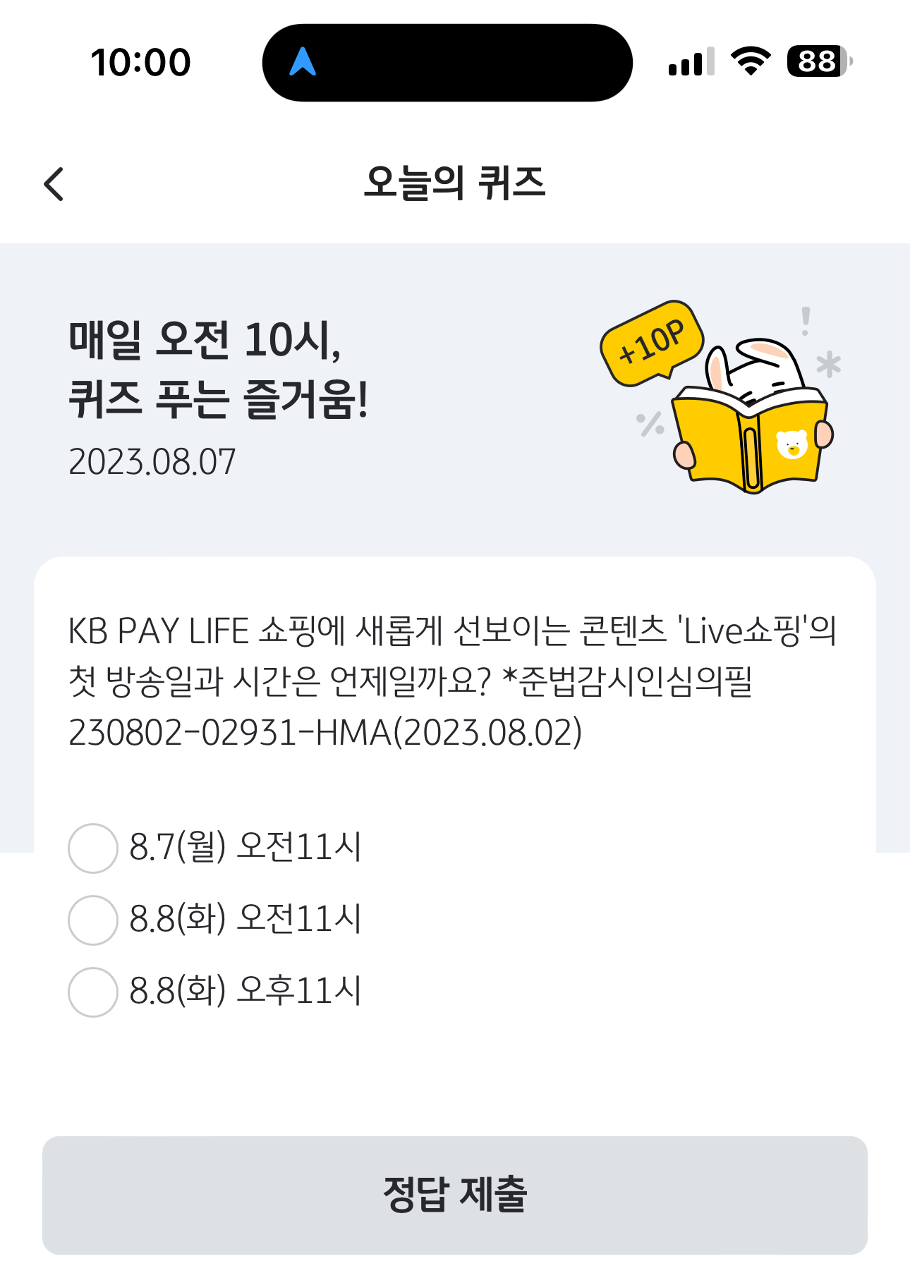 KB Pay 오늘의 퀴즈 정답은 8.8(화) 오전11시 입니다.
