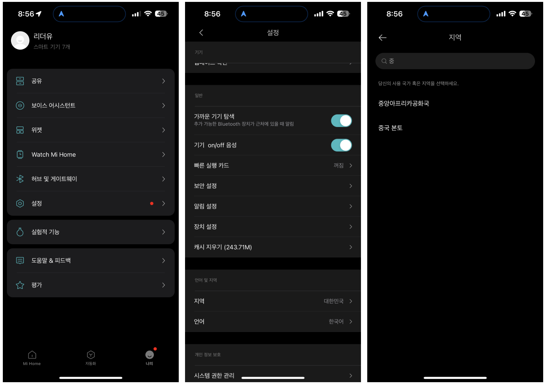 샤오미 Mi home 앱에서 지역 변경은 간단합니다. 하단의 나의 정보 탭으로 가서 설정으로 들어갑니다. 하단에 보면 언어 & 지역이 있습니다. 여기서 지역을 선택 후 중국 본토로 선택하면 됩니다. 언어는 한국어로 해도 상관 없습니다.