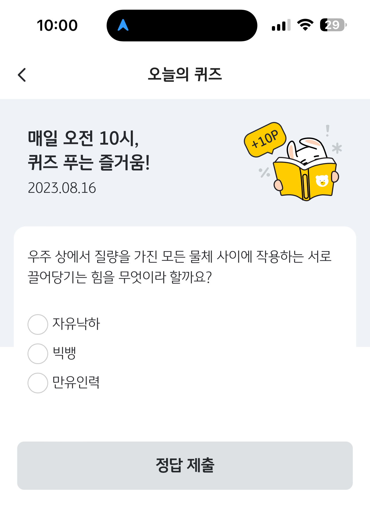 KB Pay 오늘의 퀴즈 정답은 만유인력입니다