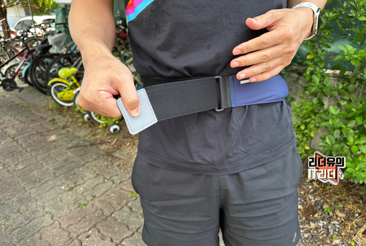 허리에 장착하고 쭉 당겨서 부착해 주면 됩니다. 간편한 연결 방식이라 좋습니다.