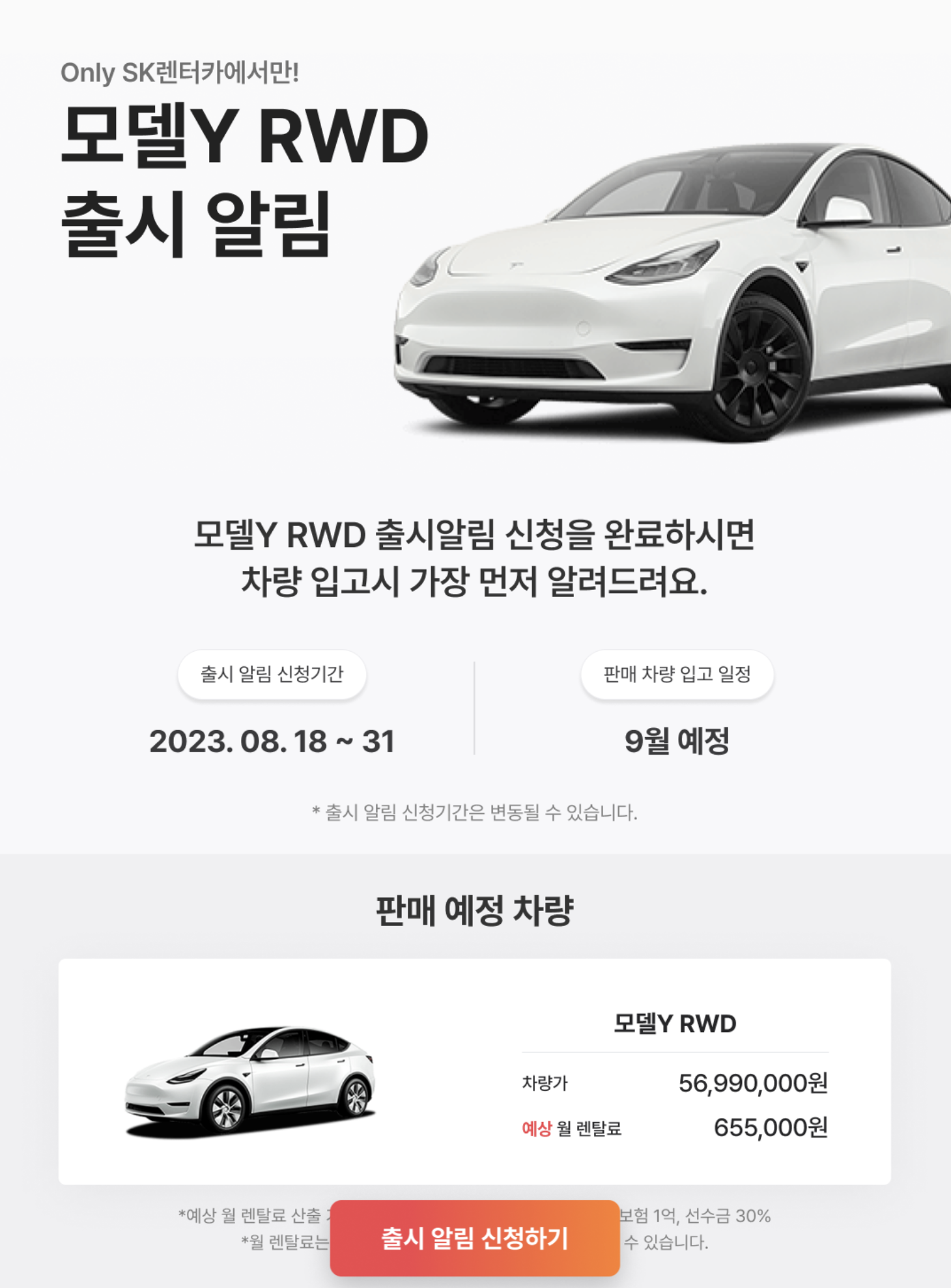 * SK렌터카 다이렉트에서 테슬라 모델Y RWD 출시 알림 신청하기