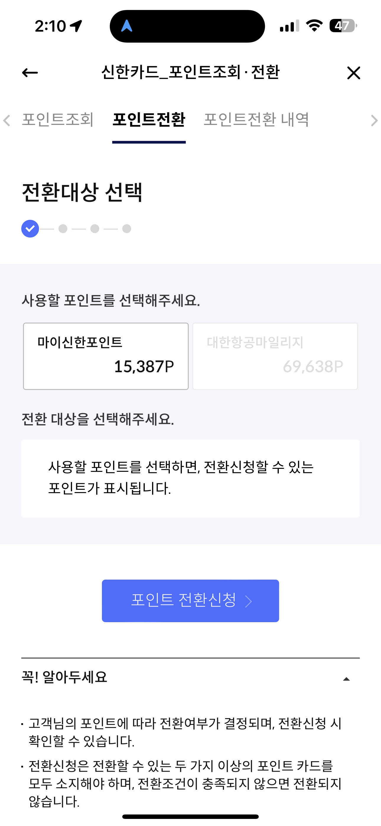 포인트전환을 누르면 마이신한포인트 포인트 전환신청을 할 수 있게 선택이 됩니다.