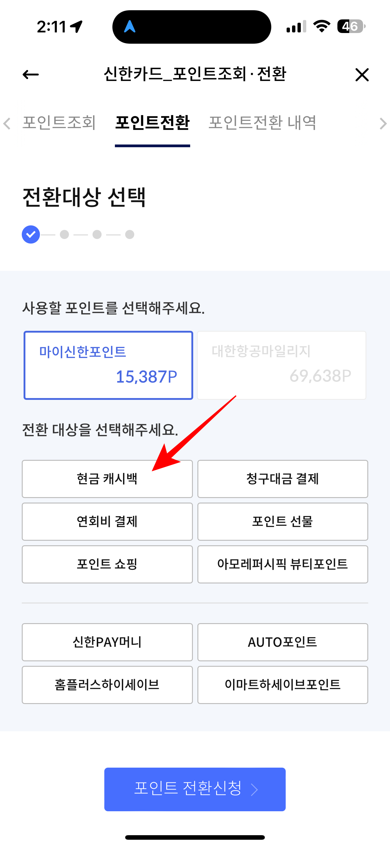 마이신한포인트를 선택하면 아래 전환 대상을 선택하게 메뉴가 나옵니다. 현금 캐시백을 받고 싶으신 분들은 현금 캐시백을 선택합니다.