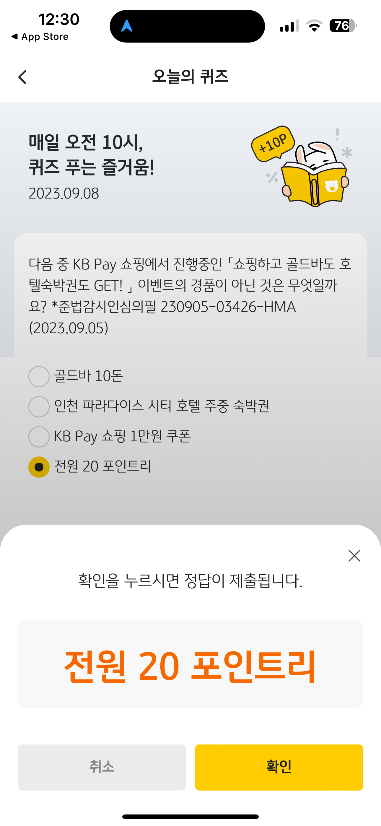 KB Pay 오늘의 퀴즈 정답은 전원 20 포인트리 입니다