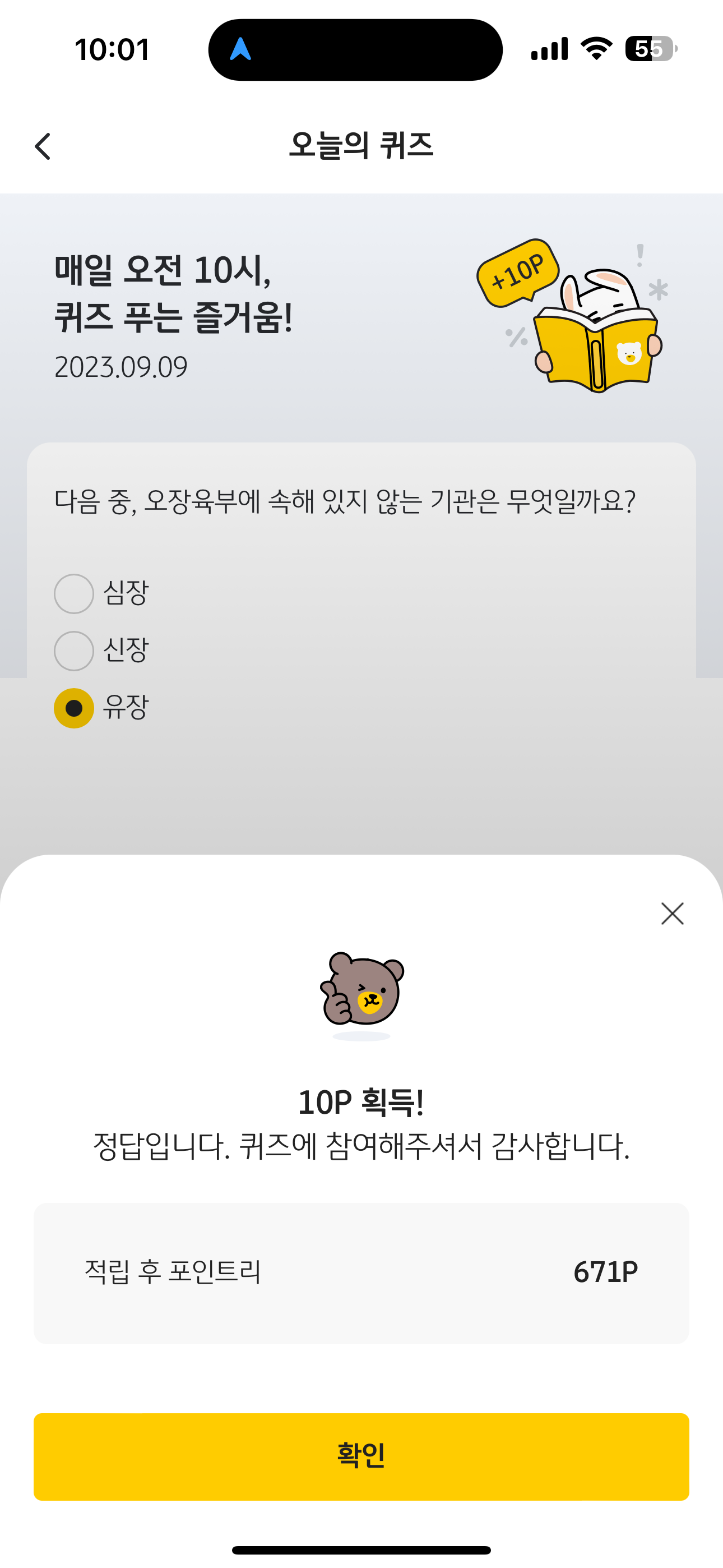 KB Pay 오늘의 퀴즈 9월 9일 정답(다음 중, 오장육부에 속해 있지 않는 기관은 무엇일까요?)