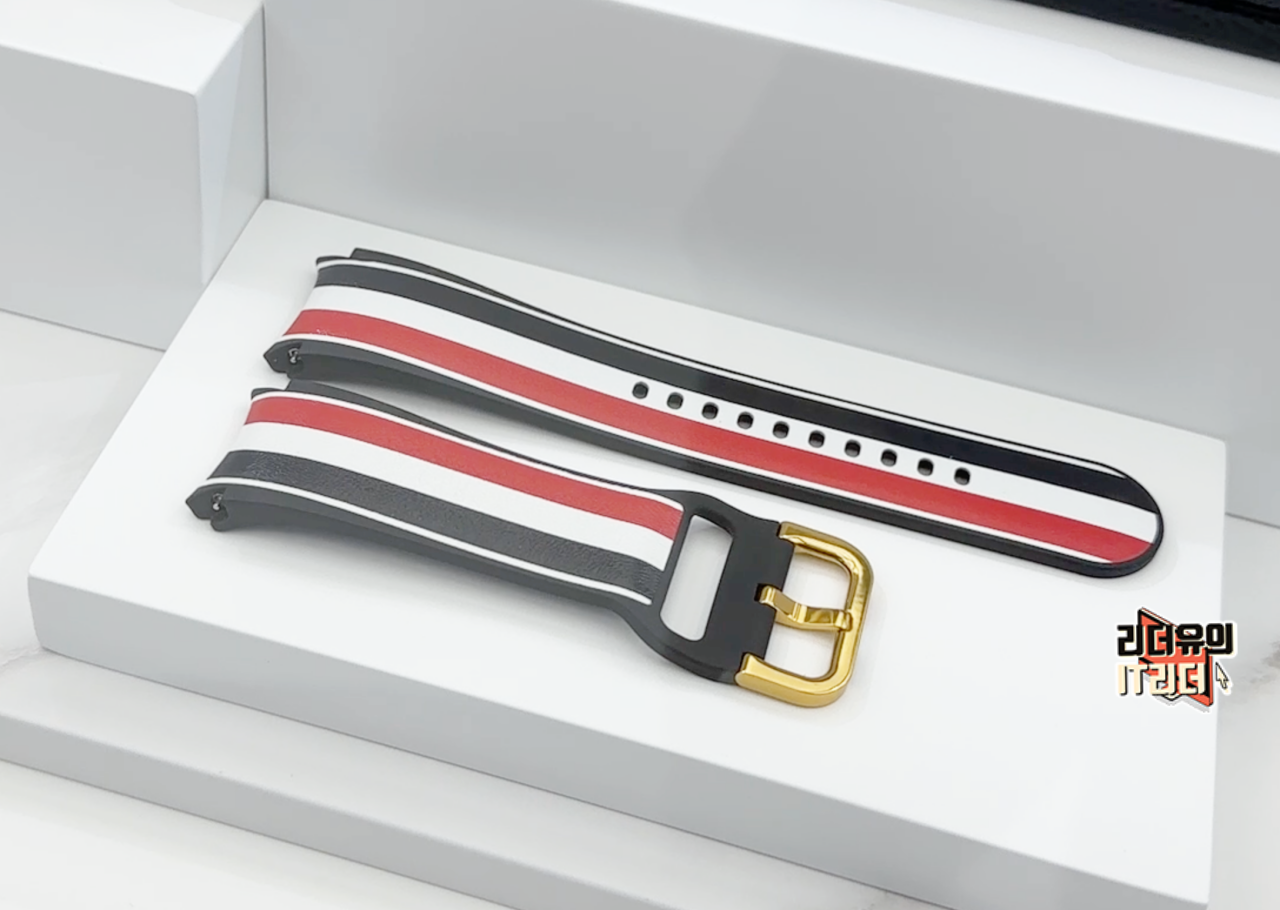 그리고 제공되는 기본 블랙 스트랩과 3색의 톰브라운 스타일의 스트랩 입니다. 이렇게 단독으로 보면 어색하지만 갤럭시워치6 톰브라운 워치페이스를 적용하면 느낌은 확 달라집니다.