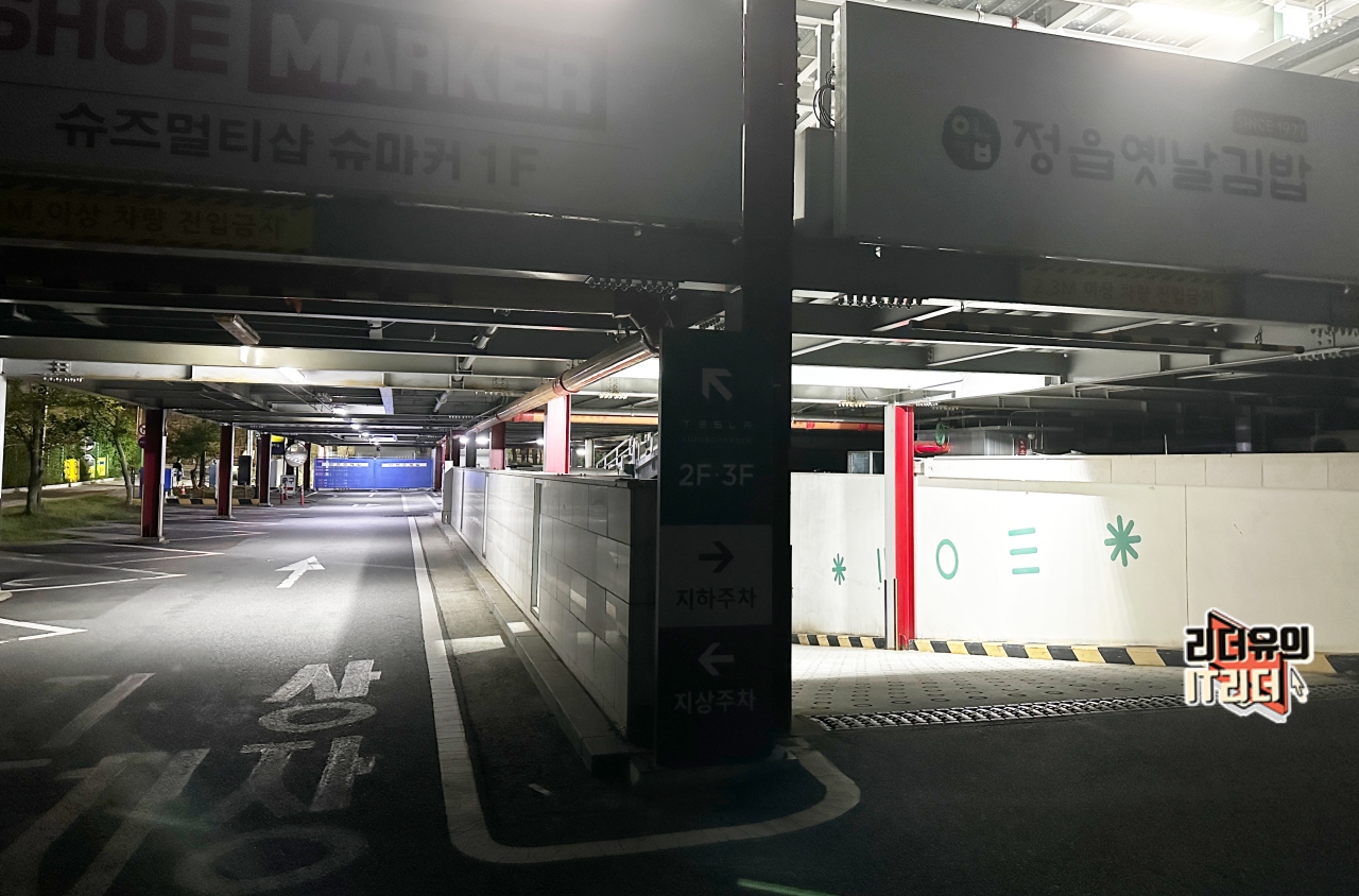 수원 더판타지움 주차장을 들어서면 지상과 지하로 주차장이 나눠져 있는데요. 수원 더판타지움 수퍼차저(수원 영통 판타지움 수퍼차저 / 슈퍼차저)는 지상 2층, 3층에 있으니 지상으로 이동하시면 됩니다. 안내 표지판이 있긴 하지만 야간에 가니 조명이 없어서 잘 안보입니다.