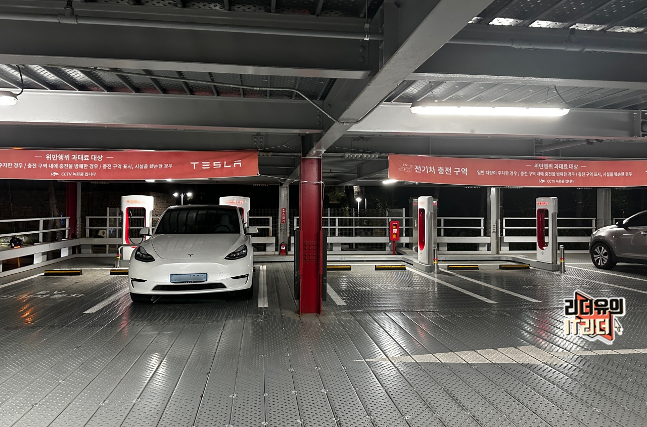 3층에 가면 완전히 오픈된 곳으로 여기도 같은 위치에 테슬라 수퍼차저 V3 4대가 설치되어 있습니다.