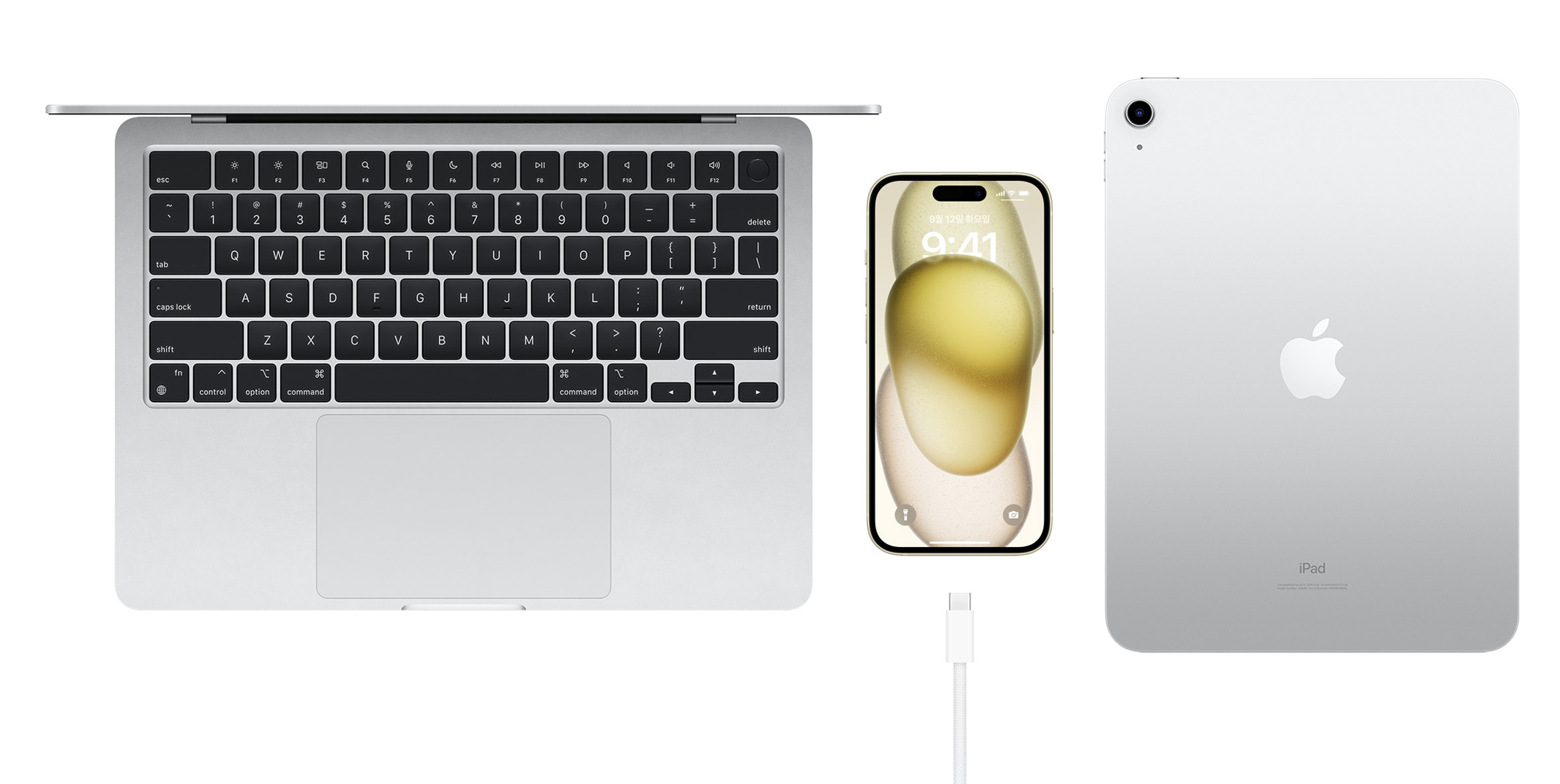 아이폰15, 아이폰15 플러스는 드디어 소문만 무성하던 USB-C 커넥터가 적용되어 케이블 호환성이 좋아졌습니다. 이미 아이패드가 USB-C 타입으로 충전을 하기 때문에 범용적인 케이블 사용이 가능해서 좋습니다. 그리고 USB-C 커텍터로 에어팟, 애플워치를 연결해 충전도 가능합니다. 참고로 USB 2 지원입니다.
