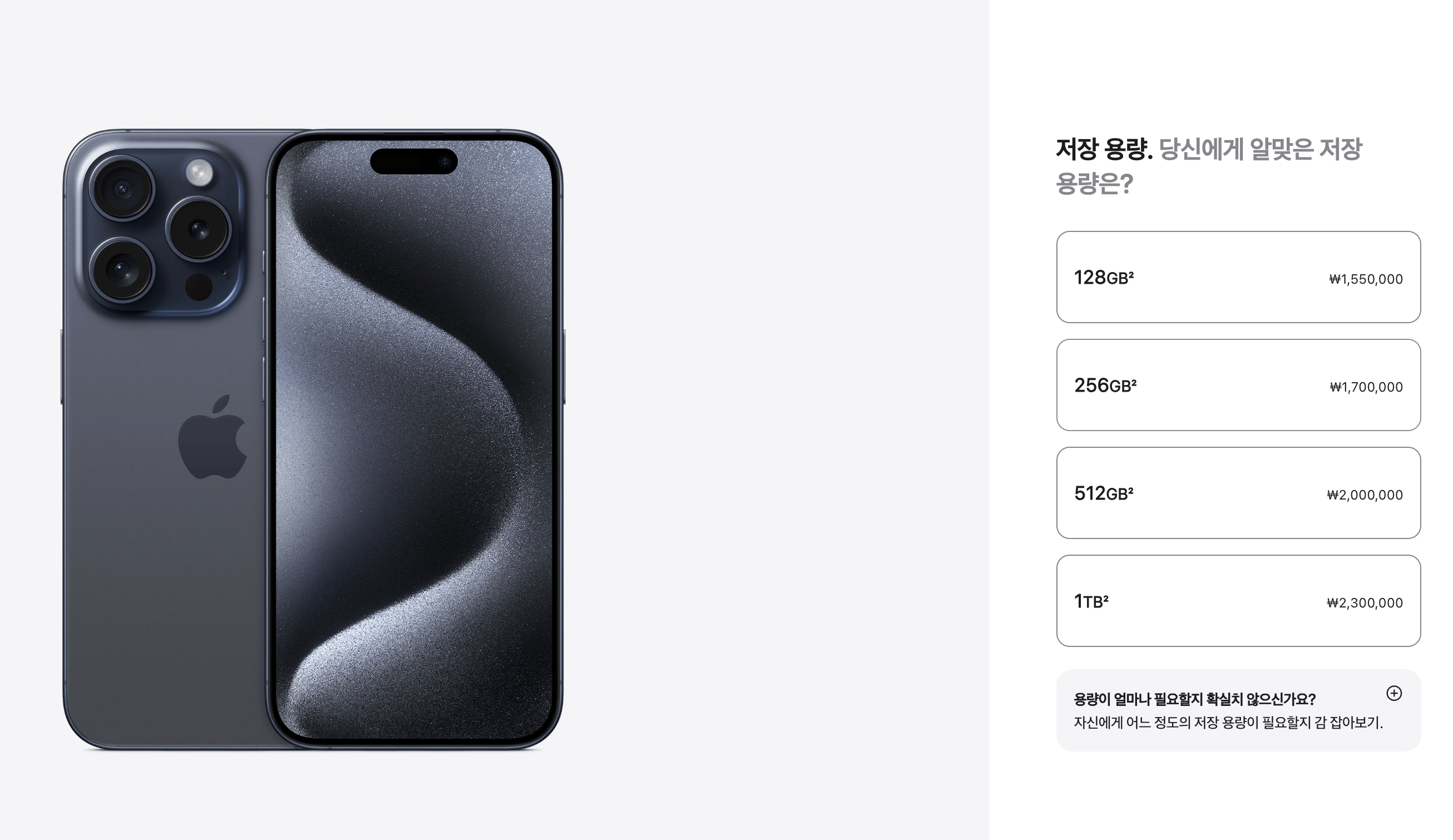 아이폰15 프로(아이폰15 Pro) 용량은 128GB, 256GB, 512GB, 1TB 선택을 할 수 있고 아이폰15 프로 맥스는 256GB, 512GB, 1TB 선택이 가능합니다
