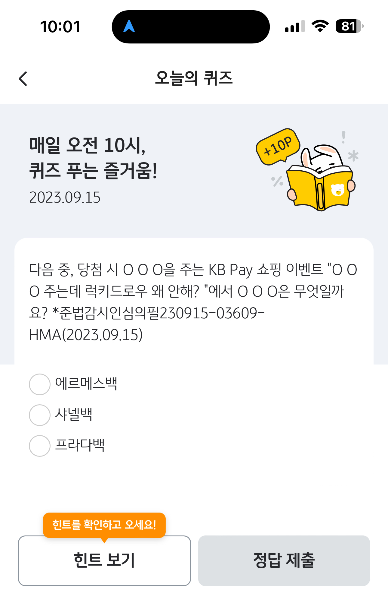 다음 중, 당첨 시 O O O을 주는 KB Pay 쇼핑 이벤트 "O O O 주는데 럭키드로우 왜 안해? "에서 O O O은 무엇일까요? *준법감시인심의필230915-03609-HMA(2023.09.15) 보기는 1. 에르메스백 2. 샤넬백 3. 프라다백 입니다. 이번 문제는 보기에 답이 보이죠.