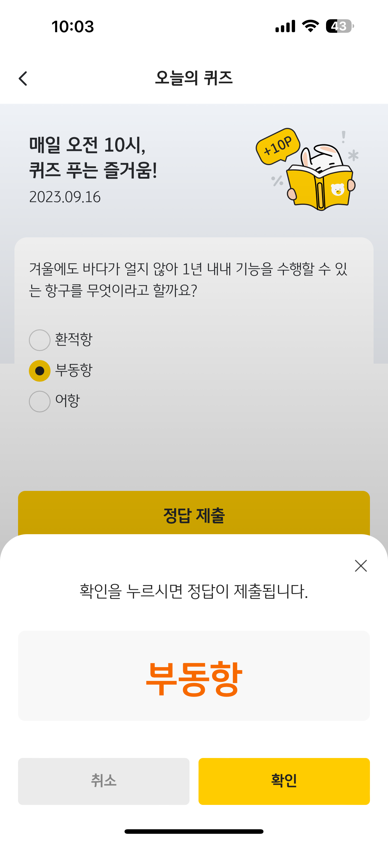 KB Pay 오늘의 퀴즈 정답은 부동항 입니다