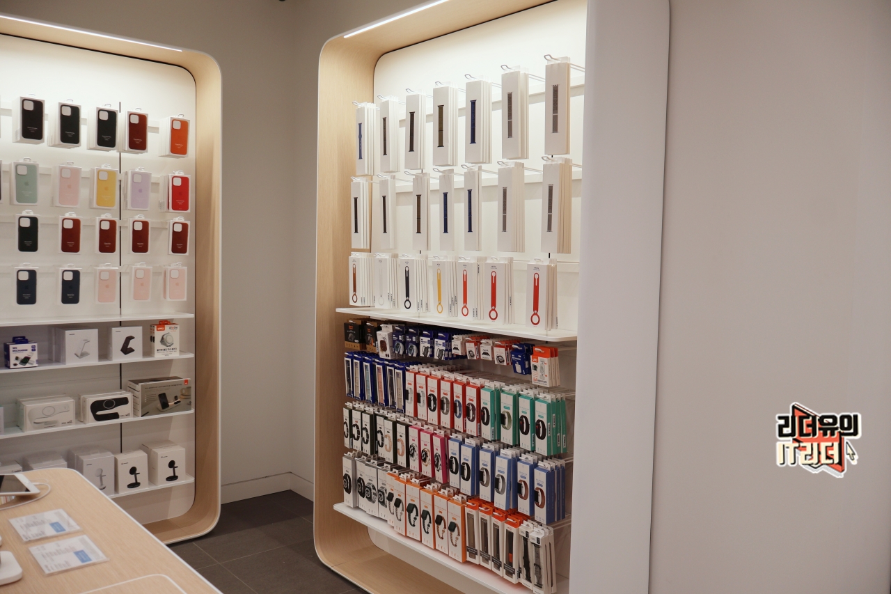 그 옆으로는 다양한 아이폰 케이스들이 전시되어 있습니다. 애플 정품 케이스 부터 서드파티 케이스까지 정말 다양한 선택을 할 수 있게 준비되어 있습니다.