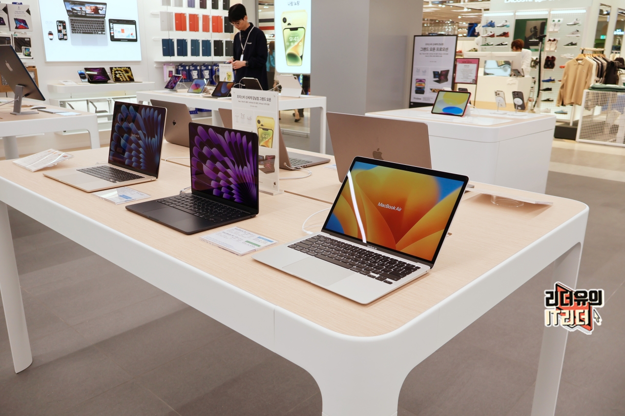 맥북프로, 맥북에어를 만날 수 있는 공간입니다. 아이폰 사용자라면 맥북도 필수라 할 수 있죠. 예쁘고 성능 좋고 다양한 선택지가 많으니 잘 비교해 보고 선택하실 수 있습니다.