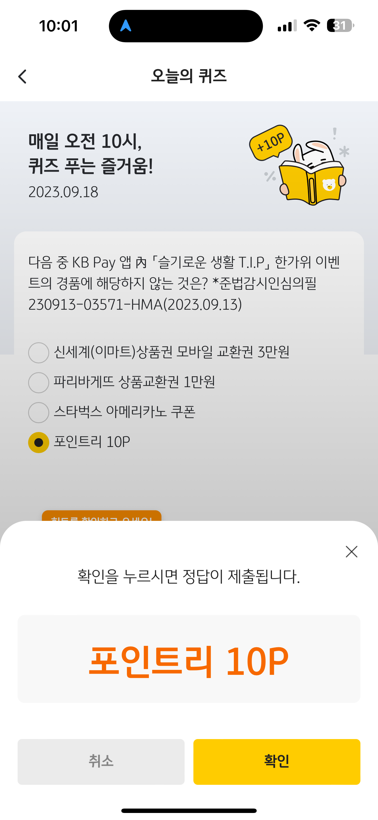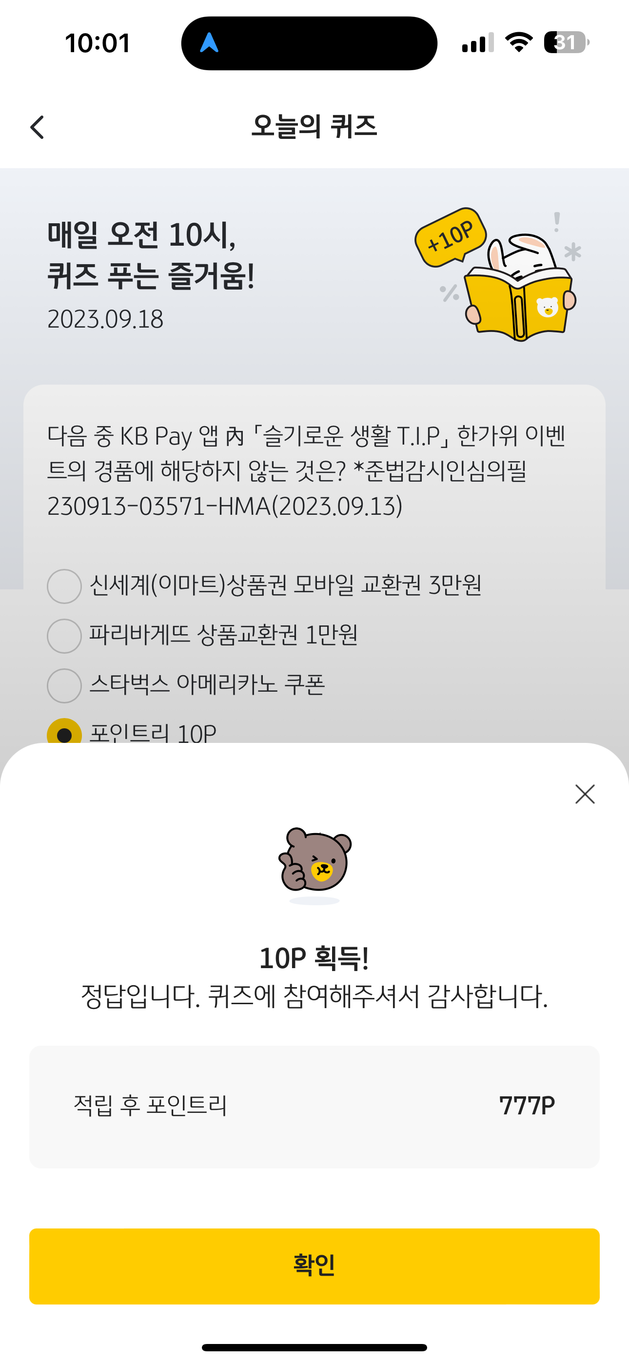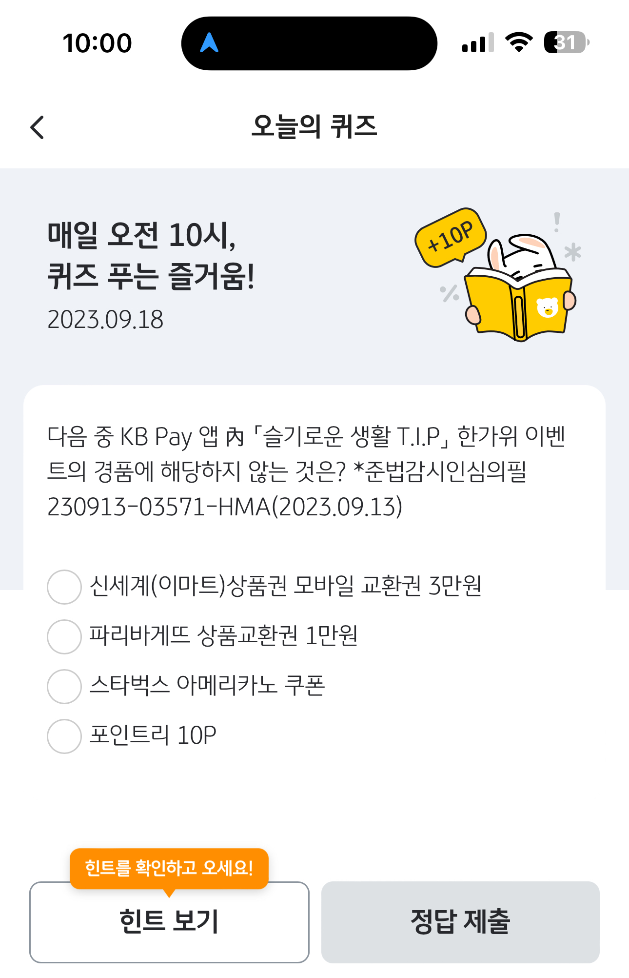 KB Pay 오늘의 퀴즈 정답은 포인트리 10P 입니다