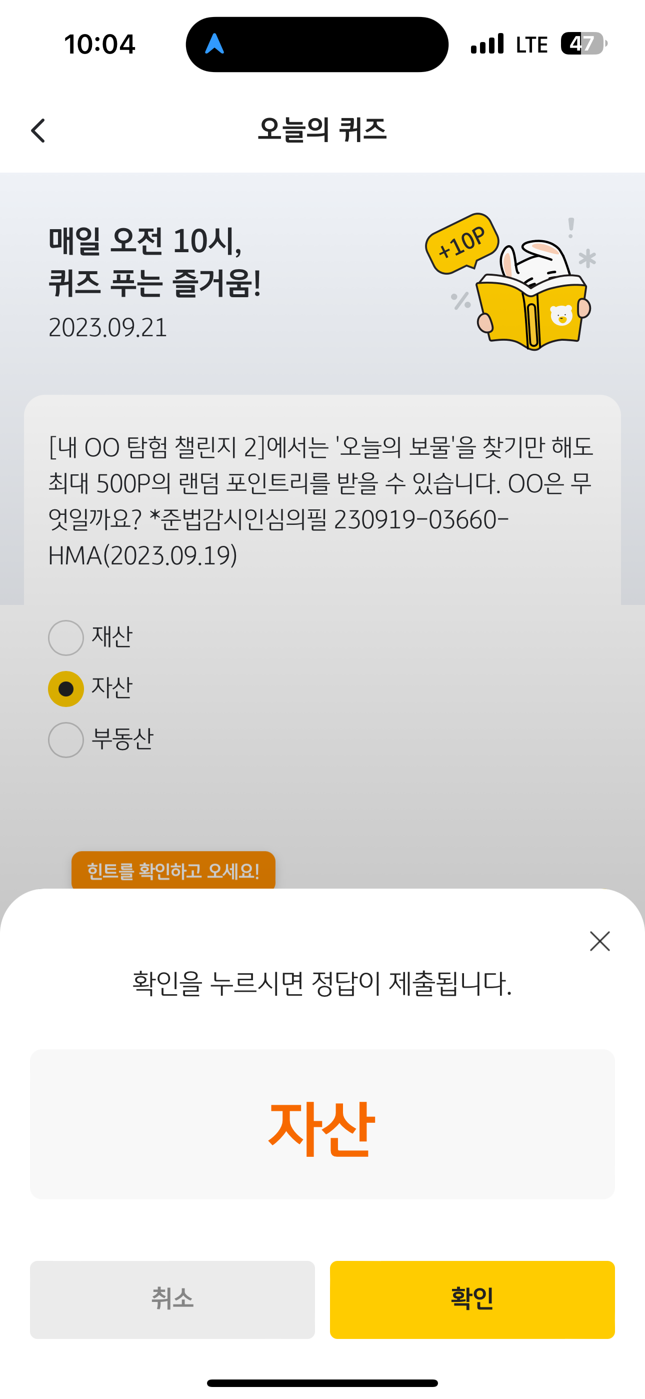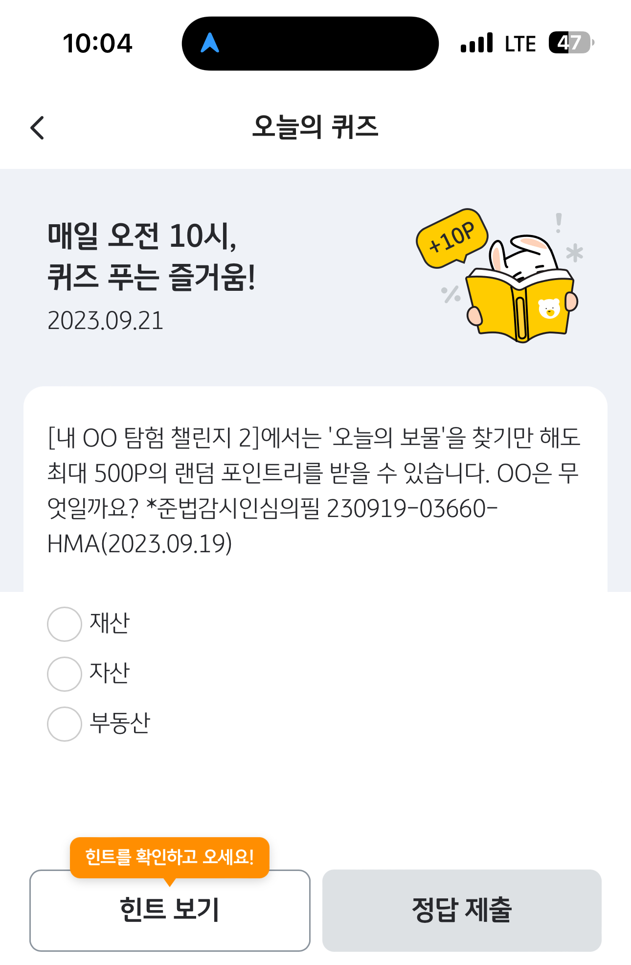 [내 OO 탐험 챌린지 2]에서는 '오늘의 보물'을 찾기만 해도 최대 500P의 랜덤 포인트리를 받을 수 있습니다. OO은 무엇일까요? *준법감시인심의필 230919-03660-HMA(2023.09.19) 보기는 1. 재산 2. 자산 3. 부동산 입니다.
