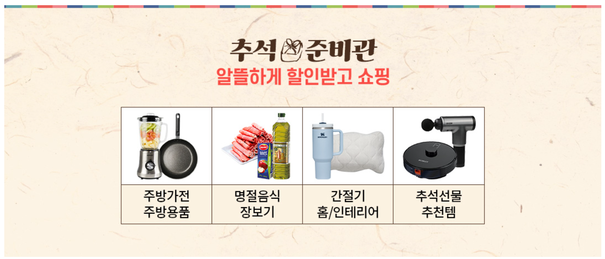 그리고 추석 준비관으로 다양한 카테고리에 맞게 추석 선물들을 좋은 가격에 선보이고 있습니다. 어머님들이 좋아할 주방가전/주방용품, 간절기 홈/인테리어 제품, 추석선물 추천템 등 다양한 구성을 볼 수 있습니다.