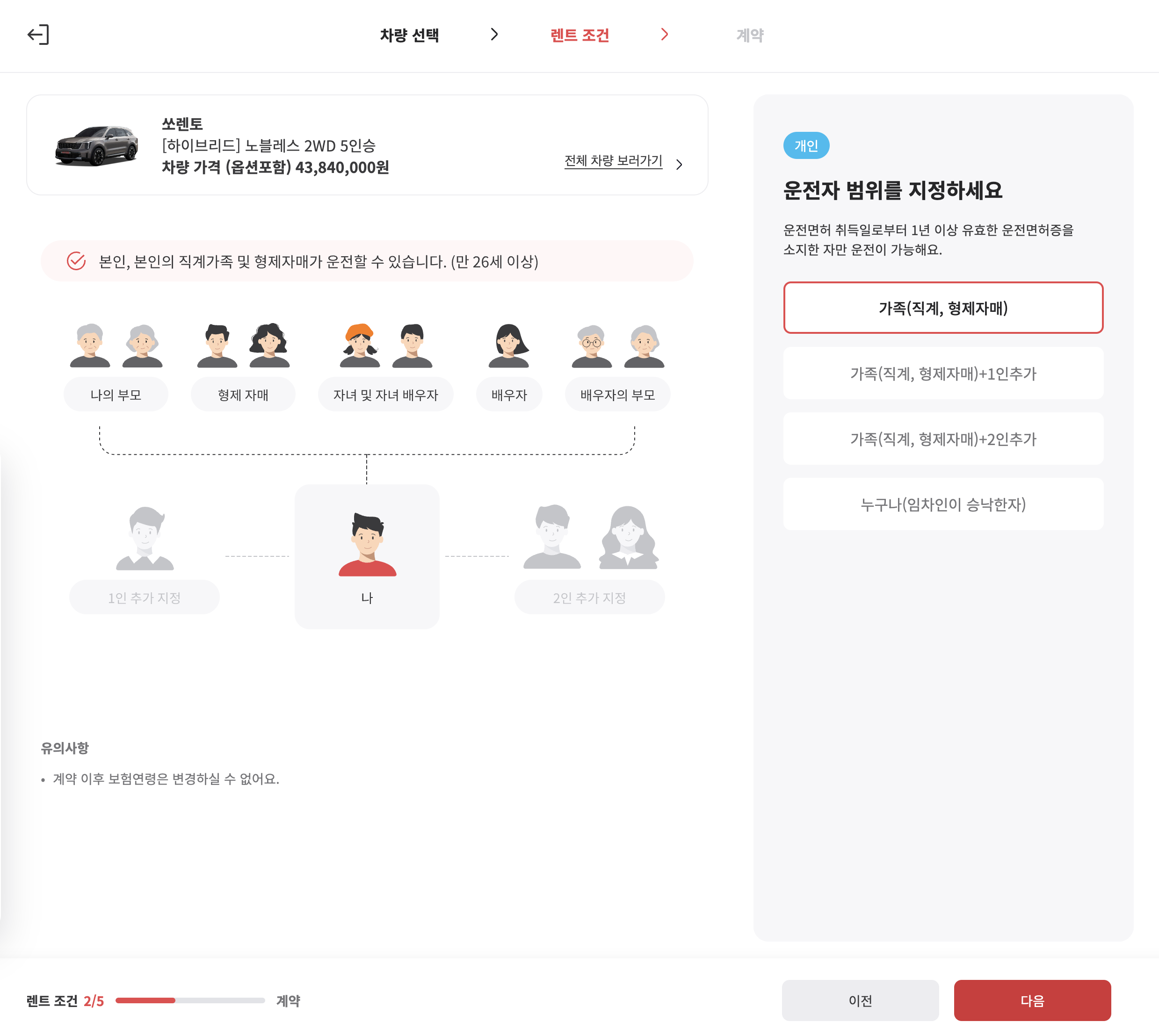 그 다음 운전자 범위를 지정합니다. 보통 집에서 사용하는 거면 가족(직계, 형제자매)을 선택하면 됩니다.