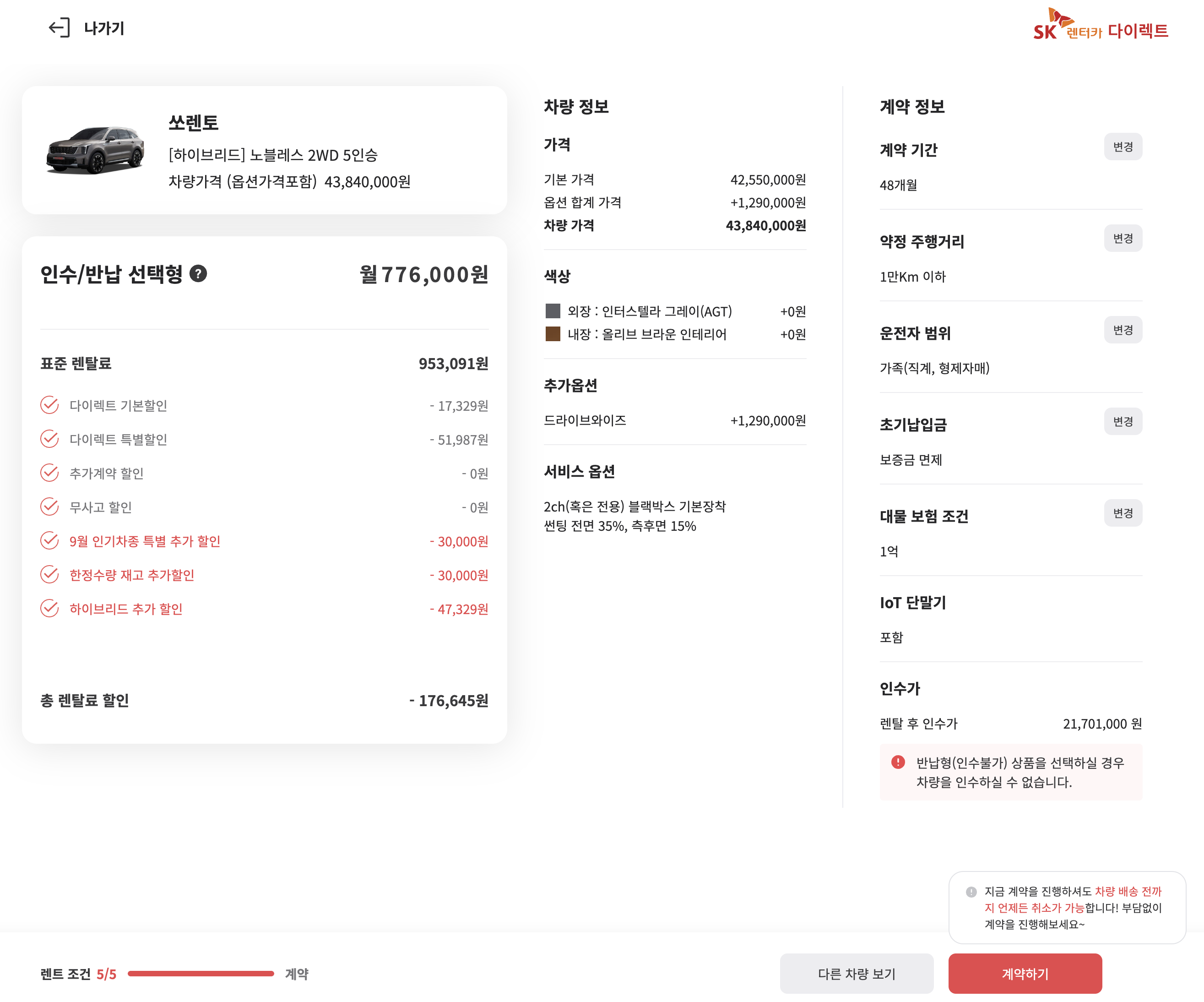 저는 인수/반납 선택형에다 초기 납입금이 없는 상황에서 월 776,000원이 나왔습니다. 9월 인기차종 특별 추가 할인, 한정수량 재고 추가할인, 하이브리드 추가 할인이 주어진 것을 알 수 있습니다. 총 할인 가격을 보면 107,329원 이죠. 이걸 만약 60개월로 계약했다고 생각해 보세요. 그럼 최대 600만원 할인이 되는 것입니다. 즉, 이렇게 쏘렌토 하이브리드 자동차 가격 할인을 받을 수 있으니 효과적으로 프로모션을 활용하면 좋습니다.