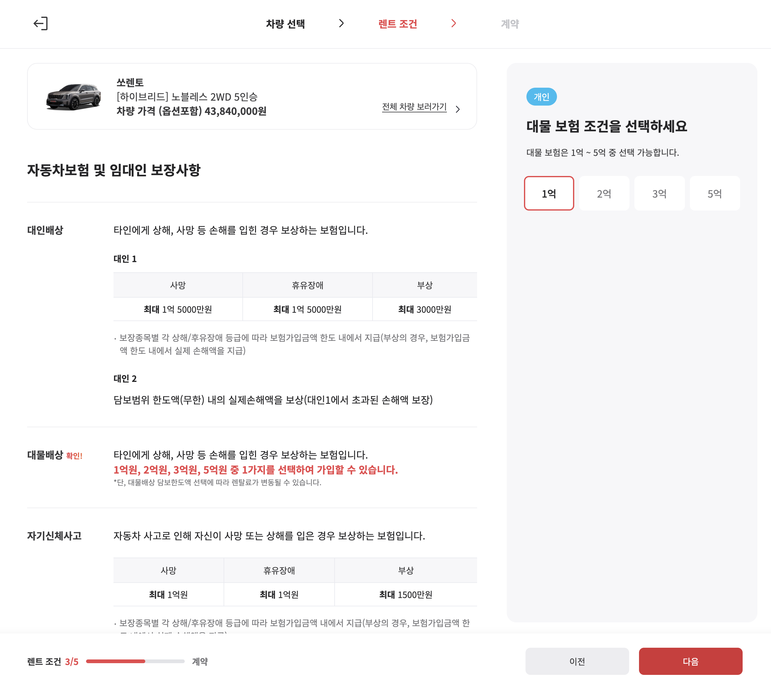 대물 보험 조건을 선택합니다. 1억, 2억, 3억, 5억 다양한 옵션이 있습니다.