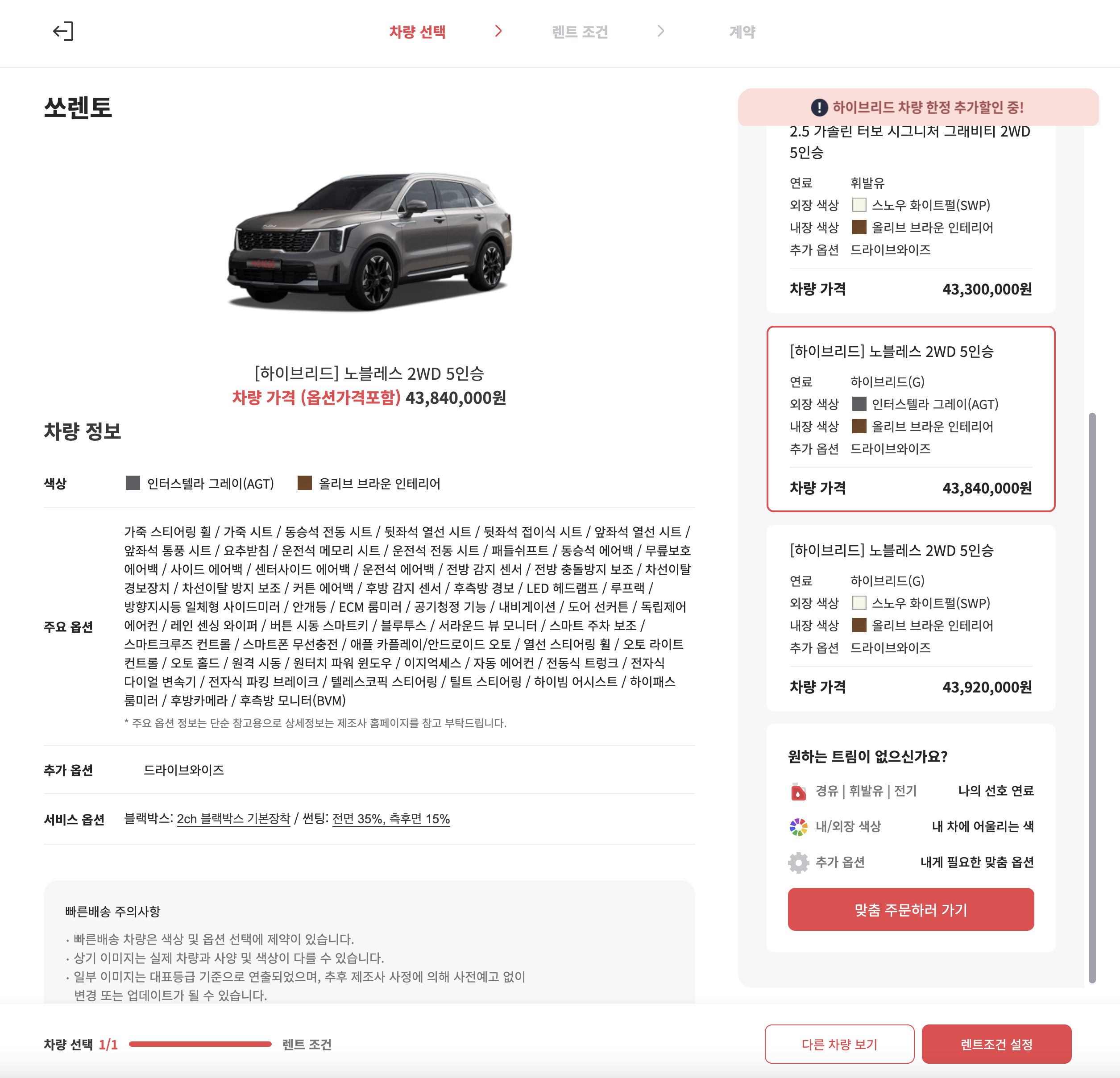 견적 확인에 들어가면 오른쪽에 쏘렌토 모델을 선택하게 나옵니다. 원하는 하이브리드 모델을 선택하고 렌트조건 설정을 선택합니다.