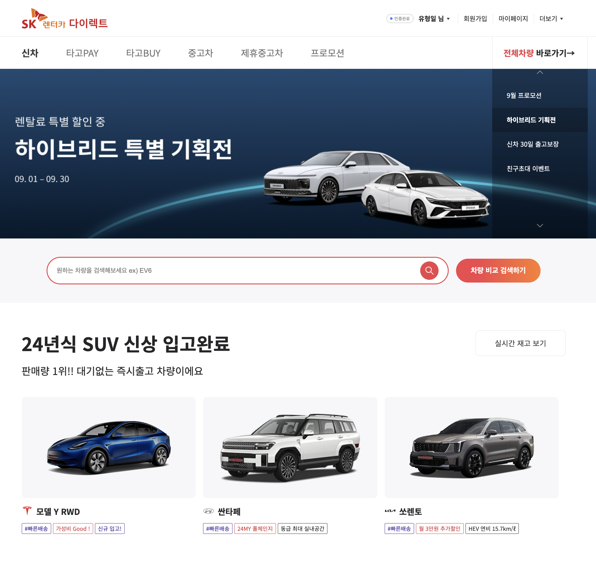 SK렌터카 다이렉트 신차 장기렌트카 하이브리드 특별 기획전 주목