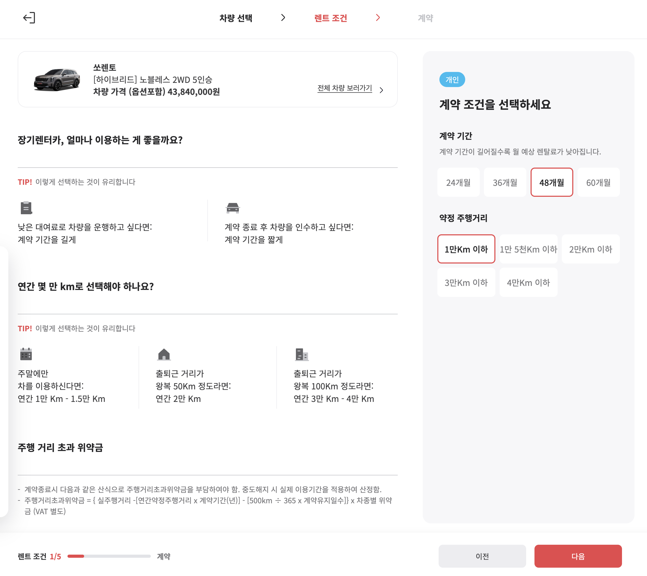 그 다음 계약 조건을 선택합니다. 계약 기관, 약정 주행거리를 선택합니다.