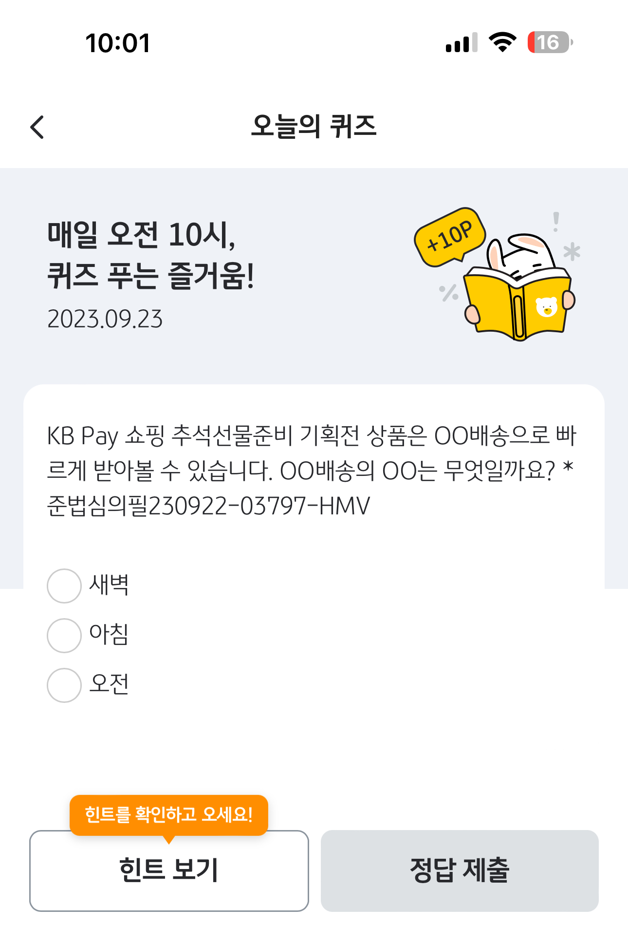 KB Pay 오늘의 퀴즈 정답은 새벽 입니다