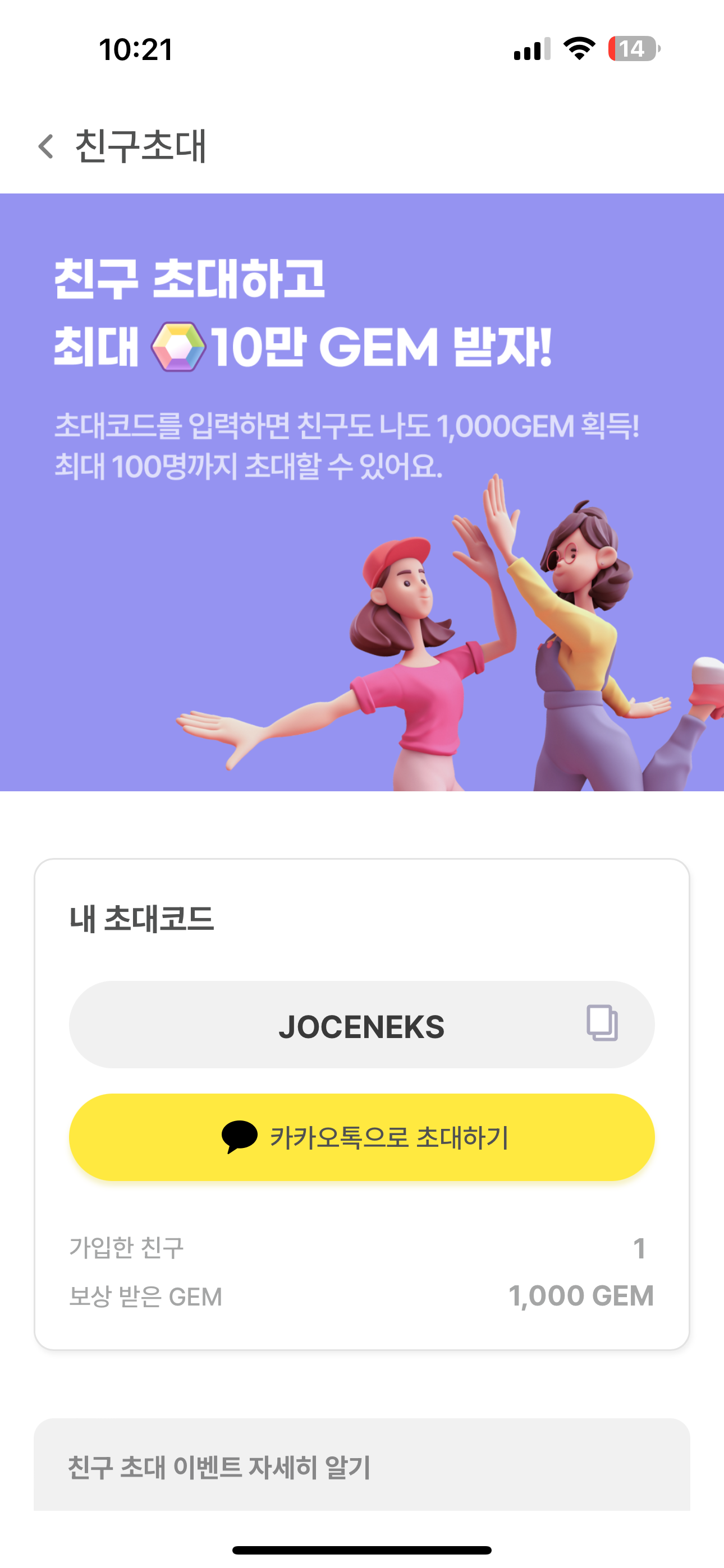 체리월드는 친구초대를 통해 초대코드로 가입한 친구도 본인도 포인트를 받을 수 있습니다. 무려 1000GEM이나 주어지니 꼭 받으셔야 합니다.