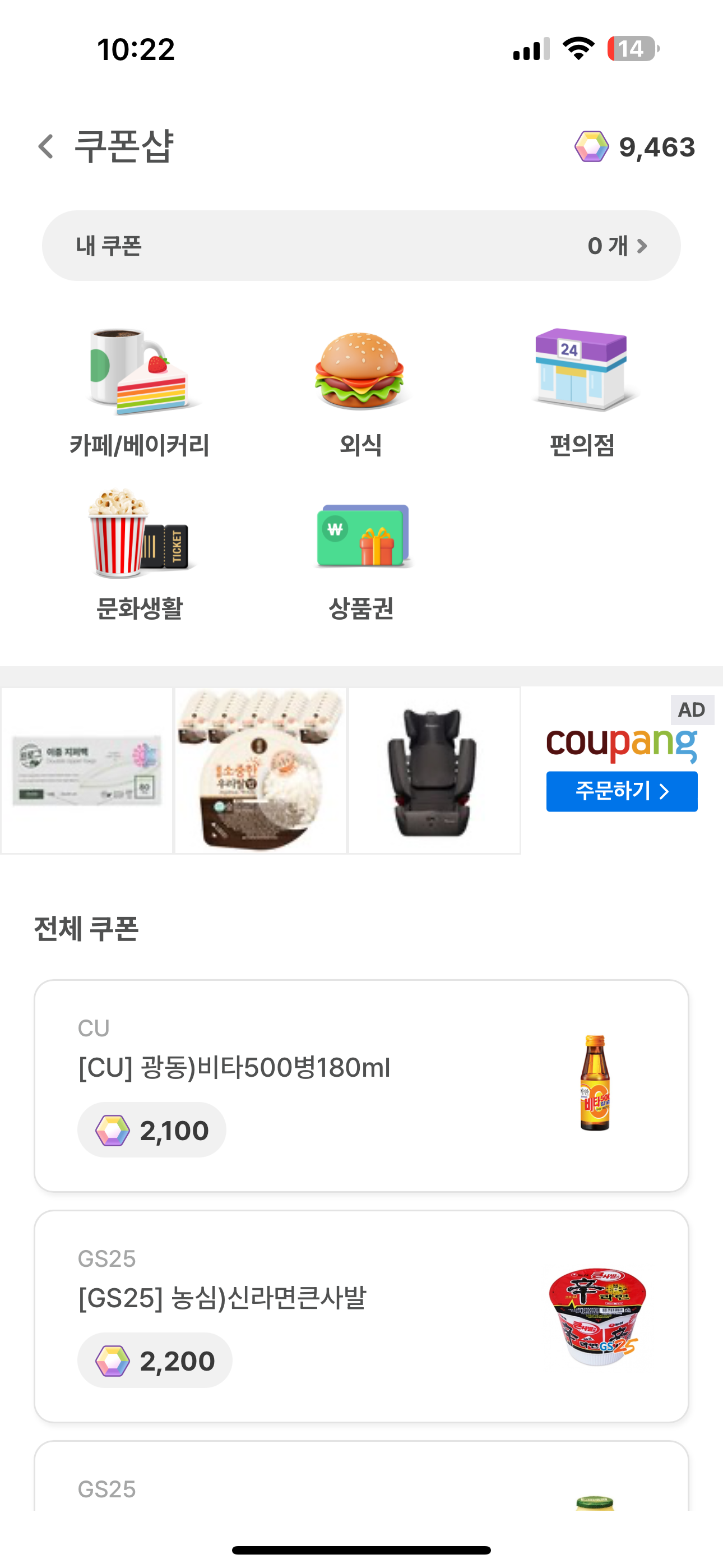 모아진 GEM은 쿠폰으로 교환이 가능한데요. 메뉴의 GEM을 누르면 쿠폰을 살 수 있는 메뉴로 갈 수 있습니다.