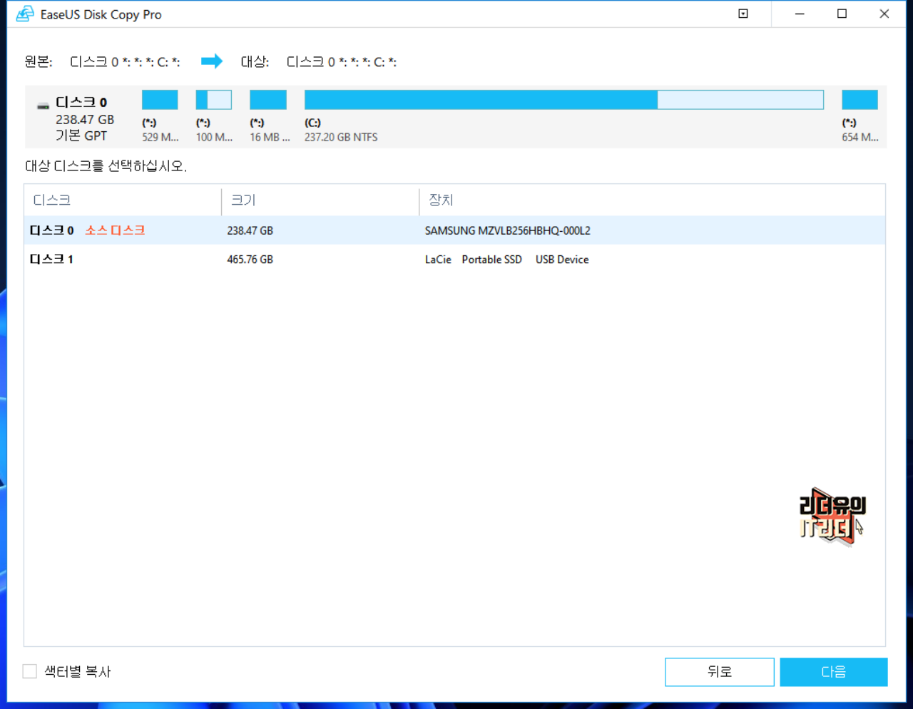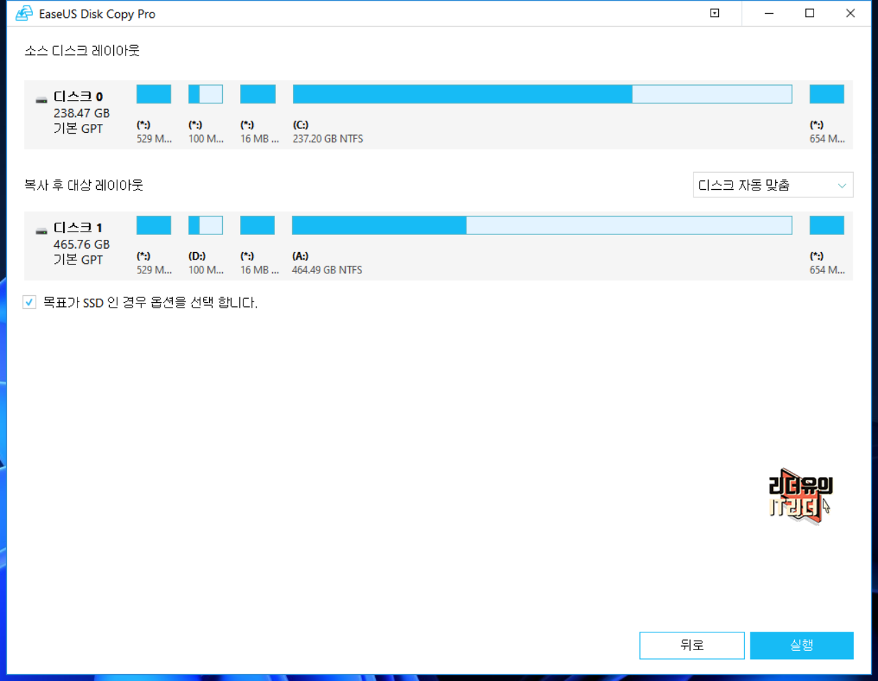 즉, 미리 삭제할 필요 없이 그냥 디스크 복제가 되니 더 편한 작업이 가능합니다.