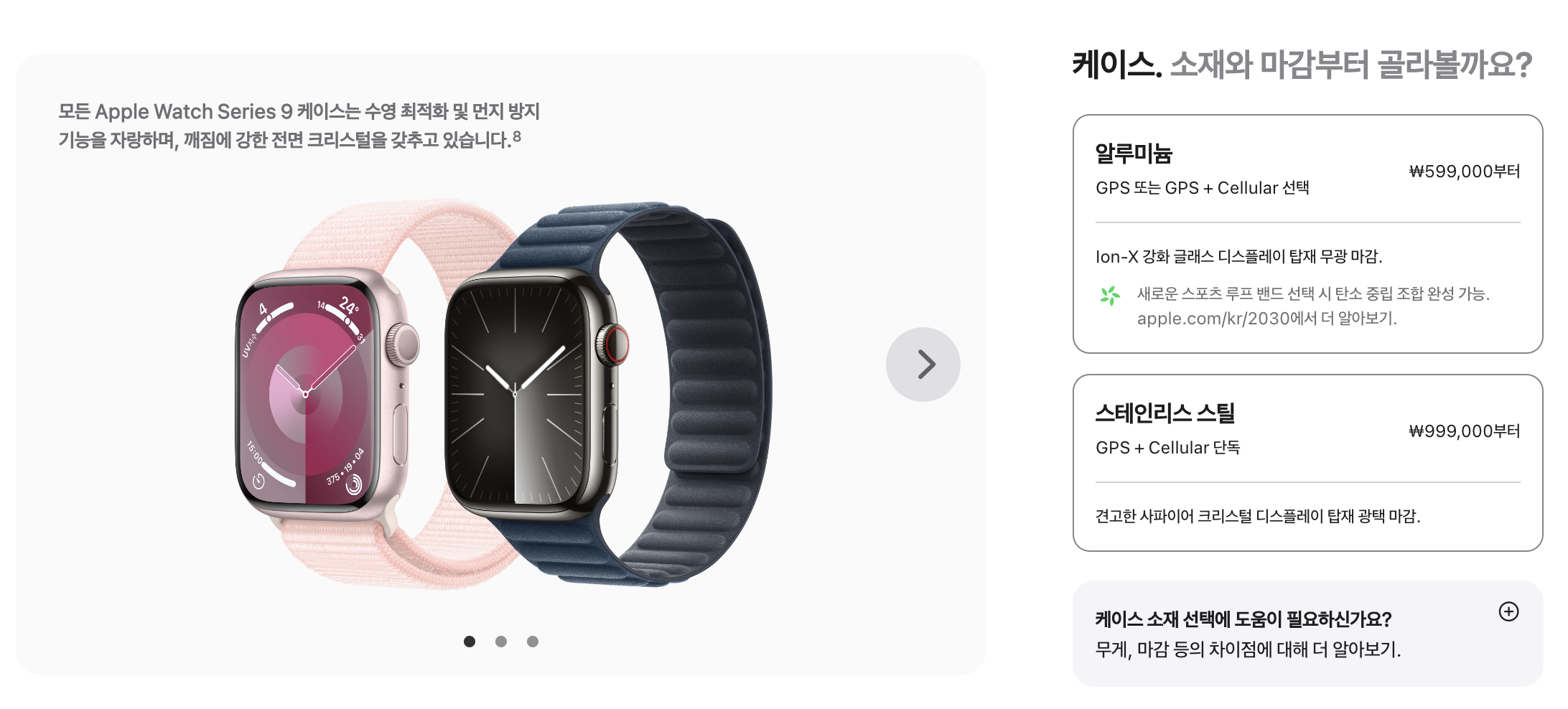 애플워치9 가격은 기본 알루미늄 모델이 599,000원부터 시작하고 스테인리스 스틸 모델은 999,000원부터 시작합니다.